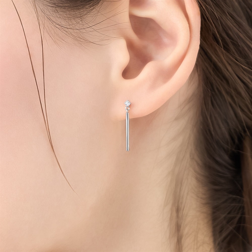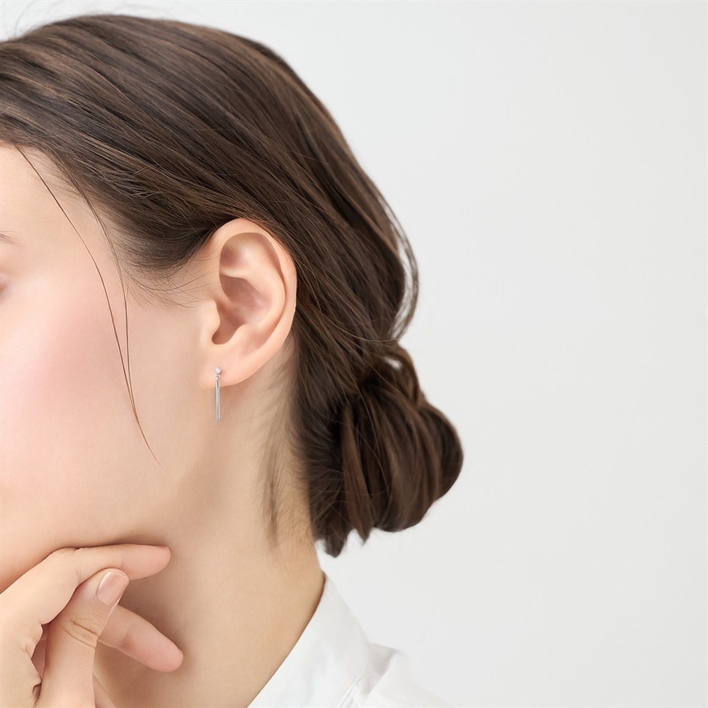 はみがき、着替え、今日のピアス -EARFLOW-毎日着けたいシンプルで合わせやすい定番-ESSENTIALS-トップのキュービックジルコニアから、シャープに伸びる細身のバーが顔周りをすっきりとした印象にするロジウムコーティングのピアス。クールなデザインは、オフィススタイルやシンプルなコーディネートのアクセントとしてお使いいただけます。スタイリッシュなデザインは永く愛用できるため、大切な方へのギフトにもおすすめです。【同コレクションのアイテムはこちら】