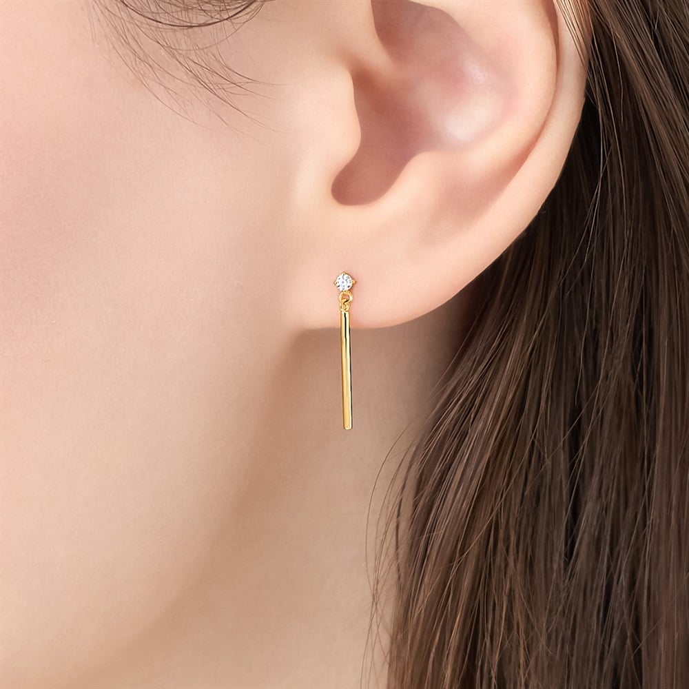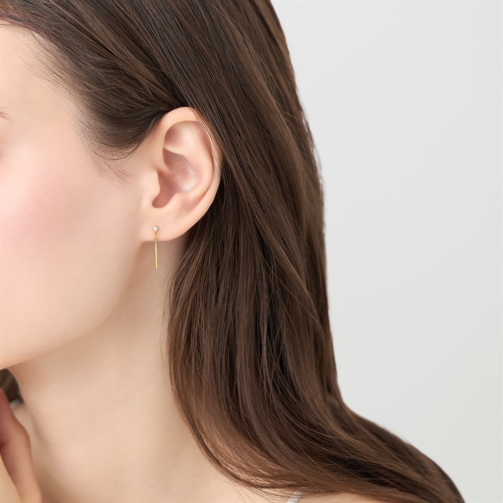 はみがき、着替え、今日のピアス -EARFLOW-毎日着けたいシンプルで合わせやすい定番-ESSENTIALS-トップのキュービックジルコニアから、シャープに伸びる細身のバーが顔周りをすっきりとした印象にするイエローゴールドカラーのピアス。クールなデザインは、オフィススタイルやシンプルなコーディネートのアクセントとしてお使いいただけます。スタイリッシュなデザインは永く愛用できるため、大切な方へのギフトにもおすすめです。【同コレクションのアイテムはこちら】