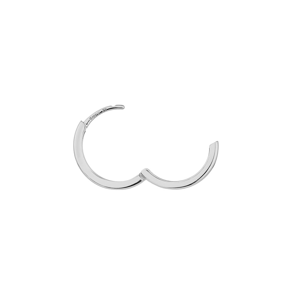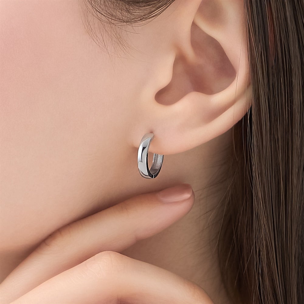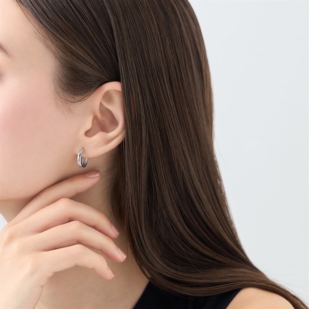 コーディネートに取り入れやすい、シンプルなロジウムコーティングのフープピアス。ほどよいサイズ感ながらも、地金の厚みが耳元に洗練された存在感を与えます。スタイリッシュなフォルムで、オフィスでのジャケットスタイルからカジュアルな装いまで幅広くお使いいただけるアイテム。日々のコーディネートをより楽しむことができるデザインは、イヤーカフとのご自身へのご褒美におすすめです。