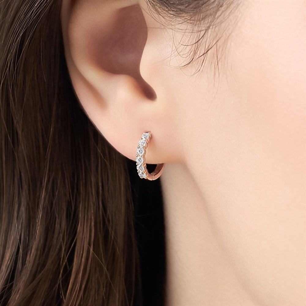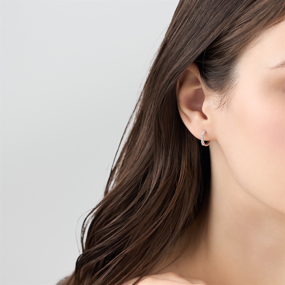 はみがき、着替え、今日のピアス -EARFLOW-毎日着けたいシンプルで合わせやすい定番-ESSENTIALS-きらめくキュービックジルコニアが上品な輝きを放つ、ピンクゴールドカラーのフープピアス。ほどよく華やかなサイズが耳元を明るく彩り、普段のカジュアルな装いを格上げするのはもちろん、特別な日のアクセントとしてもおすすめです。主張しすぎないボリュームのため、シーンを問わずにお使いいただけます。【同コレクションのアイテムはこちら】
