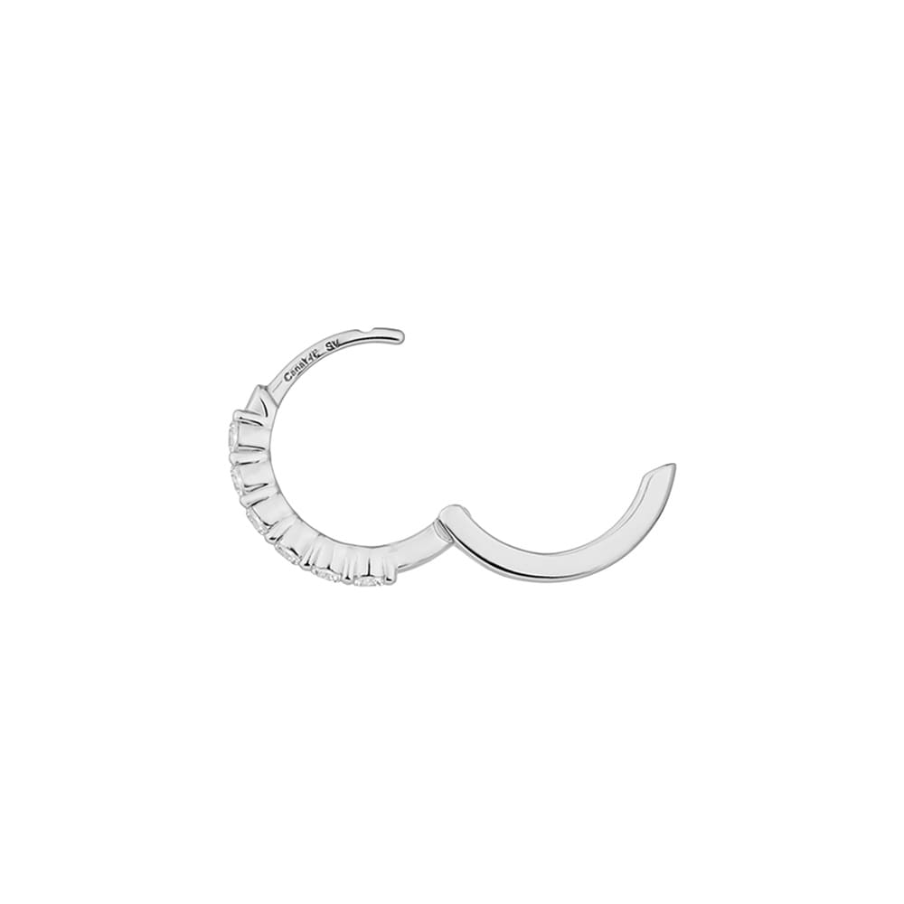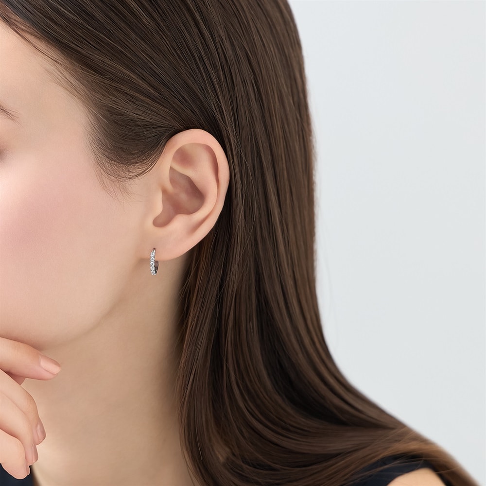 はみがき、着替え、今日のピアス -EARFLOW-毎日着けたいシンプルで合わせやすい定番-ESSENTIALS-きらめくキュービックジルコニアが上品な輝きを放つ、ロジウムコーティングのフープピアス。ほどよく華やかなサイズが耳元を明るく彩り、普段のカジュアルな装いを格上げするのはもちろん、特別な日のアクセントとしてもおすすめです。主張しすぎないボリュームのため、シーンを問わずにお使いいただけます。【同コレクションのアイテムはこちら】
