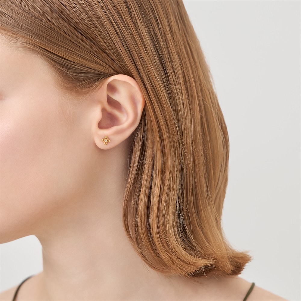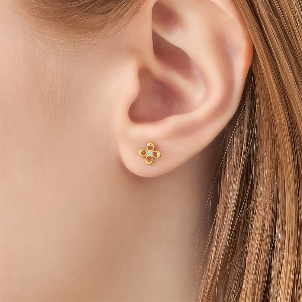 はみがき、着替え、今日のピアス -EARFLOW-カラーやモチーフでその日の気分をスイッチ-MOOD-4枚の花びらを透かしのデザインで軽やかに仕上げた、お花モチーフのピアス。華やかなイエローゴールドカラーに、1粒のキュービックジルコニアが中央で繊細にきらめきます。縁取りにほどこしたミルのラインが、クラシカルで洗練されたディテールを演出。さり気ないサイズ感で顔周りを明るく彩り、デイリーからオフィスシーンまで幅広く活躍するアイテムです。【同コレクションのアイテムはこちら】
