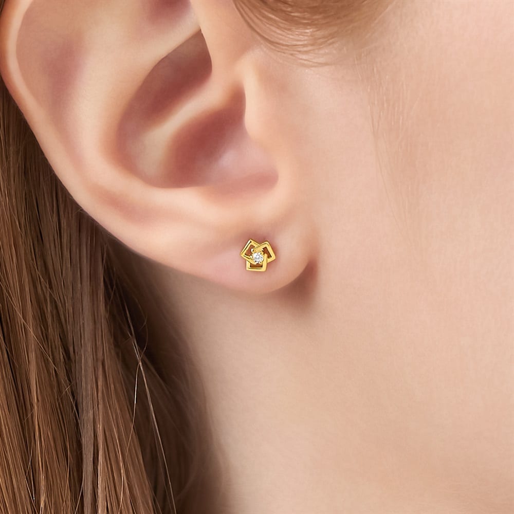 はみがき、着替え、今日のピアス -EARFLOW-カラーやモチーフでその日の気分をスイッチ-MOOD-3つのスクエアを重ねた幾何学的なデザインのピアス。華やかなイエローゴールドカラーのシャープなラインが交差し、中央には1粒のキュービックジルコニアが繊細にきらめきます。さり気ないサイズ感ながらも、立体的なフォルムが耳元に洗練されたアクセントを添えます。どんなスタイリングにもなじみやすく、毎日のコーディネートを格上げしてくれるアイテムです。【同コレクションのアイテムはこちら】