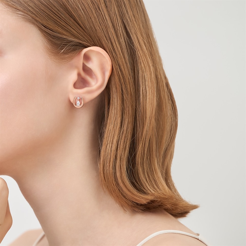 はみがき、着替え、今日のピアス -EARFLOW-カラーやモチーフでその日の気分をスイッチ-MOOD-幸せを呼び込むといわれる馬蹄モチーフのピアス。肌なじみのよいピンクゴールドカラーのラインの中で、大粒のしずく型のキュービックジルコニアが揺れ動く華やかなデザインです。程よいボリューム感があり、動きに合わせてキラキラときらめく輝きが耳元を洗練された印象へと導きます。日常のスタイリングに気品を添えてくれる、ご自身へのお守りジュエリーや大切なひとへのギフトにもおすすめのアイテムです。【同コレクションのアイテムはこちら】