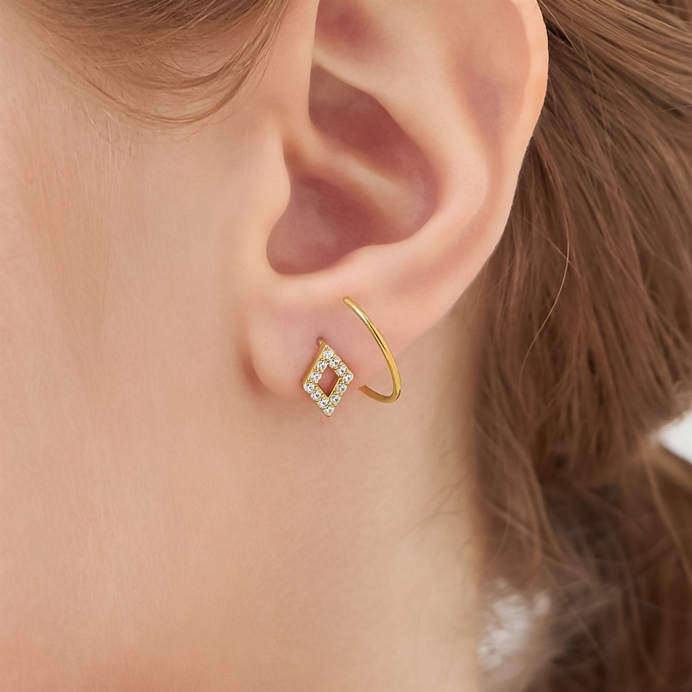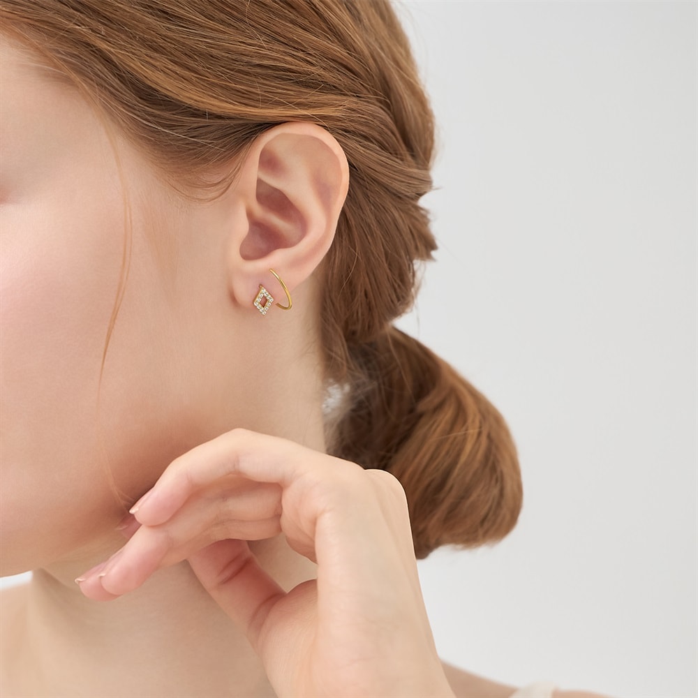 はみがき、着替え、今日のピアス -EARFLOW-カラーやモチーフでその日の気分をスイッチ-MOOD-ひし形のシルエットにキュービックジルコニアを贅沢にほどこした片耳用ピアス。華やかなイエローゴールドカラーに、モチーフに沿って並んだ石がキラキラときらめきます。透かしを取り入れたシャープなラインが耳元に洗練されたアクセントを添え、顔周りを明るく彩ります。程よい存在感があり、日常のスタイリングからドレスアップまで幅広く活躍するアイテムです。※強い力が加わると変形する可能性がありますので、お取り扱いにはご注意ください。【同コレクションのアイテムはこちら】