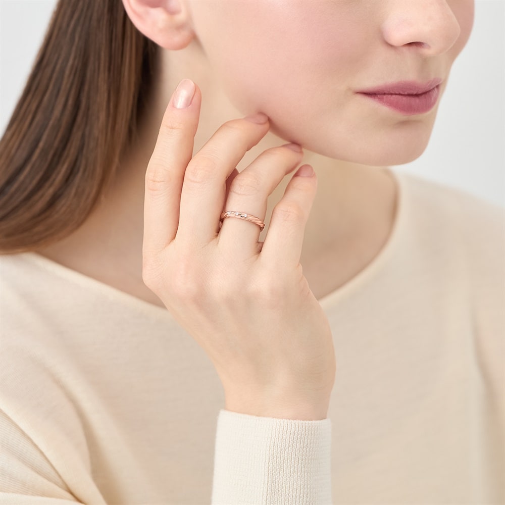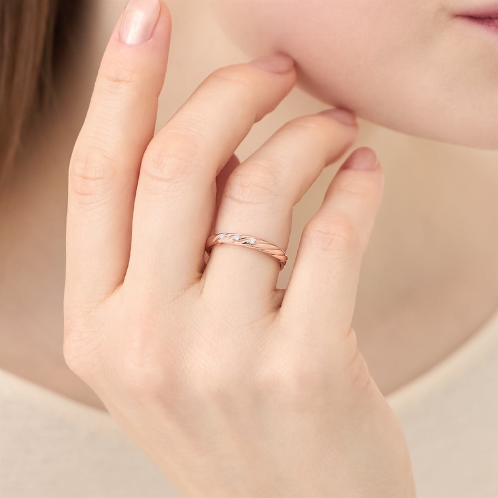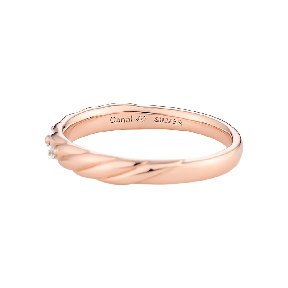 三石のストーンがきらめく、ひねりデザインのペアリング。ひねりデザインは、「永遠の愛」「絆」の意味を持ちます。トレンド感のあるデザインは、オフィスシーンからお出かけシーンまで、幅広くお使いいただけます。シンプルなデザインのため、大切な方へのギフトにおすすめです。※ボリューム(幅)のあるリングは、通常より着用時にサイズが小さく感じる場合がございます。