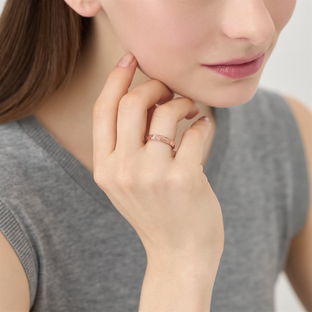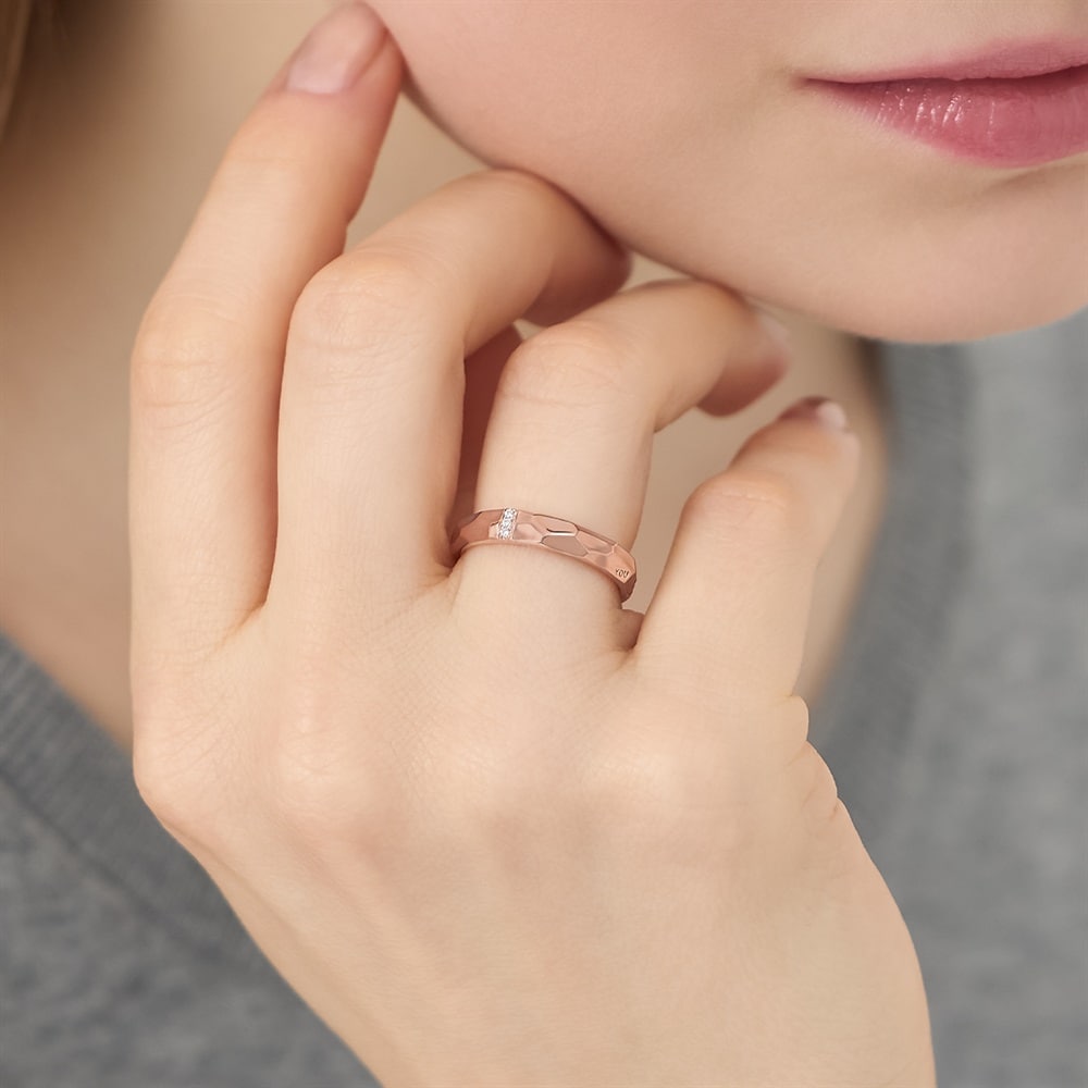 地金のテクスチャーとストーンがきらめく、ストレートデザインのペアリング。トレンド感のあるシンプルなデザインのため、日常的に身に着けることができます。細身のシンプルなクロスリングとの重ね着けにおすすめです。※ボリューム(幅)のあるリングは、通常より着用時にサイズが小さく感じる場合がございます。