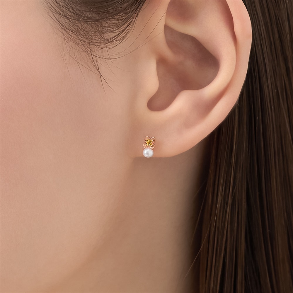 はみがき、着替え、今日のピアス -EARFLOW-自分仕様にカスタマイズ 選ぶ楽しさをその手に-CUSTOM FIT-K10ピンクゴールドの地金に、温かみのあるイエローカラーが美しいシトリンと淡水パールをあしらった可憐な印象のピアス。お花のようなかたちにセットされたシトリンが耳元に明るい彩りを添え、その下で寄り添うパールが上品な輝きを放ちます。「希望」や「富」の意味を持つといわれる、11月誕生石シトリンを配したジュエリーは、大切なひとへのギフトやご自身のお守りとしてもおすすめです。※天然石・天然素材を使用しているため、実際の色味や風合いが異なる場合がございます。【同コレクションのアイテムはこちら】