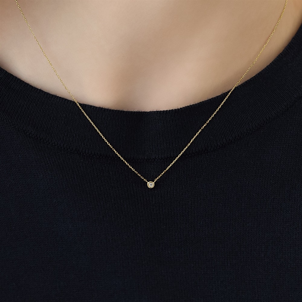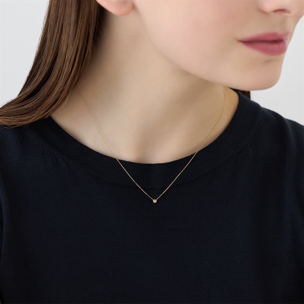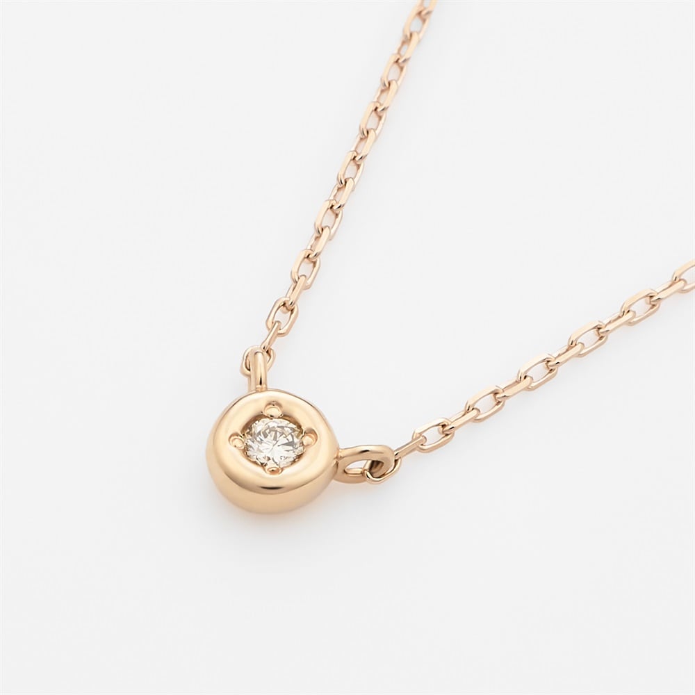 4月の誕生石、ダイヤモンドを留めた1粒ネックレス。どんなスタイリングにも合わせやすく、1本は持っていたいアイテム。他のネックレスとのレイヤードもおすすめです。