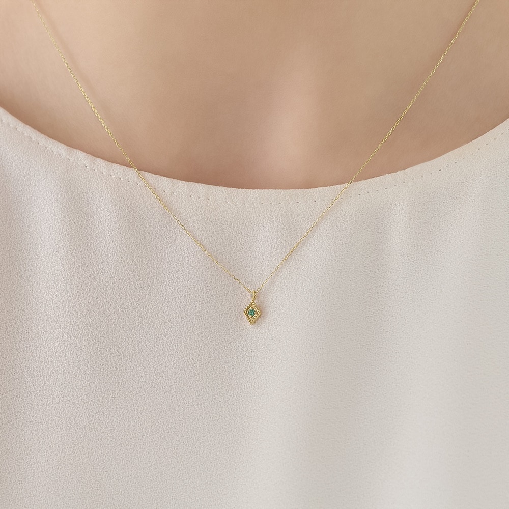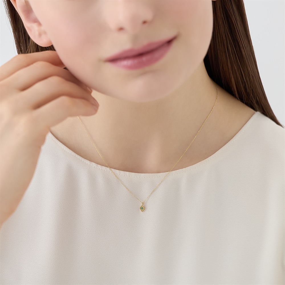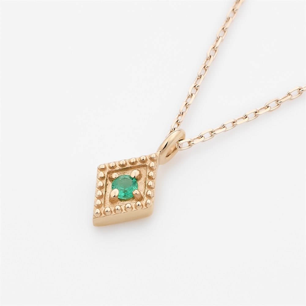 5月の誕生石、エメラルドを留めた1粒ネックレス。ダイヤ型のフォルムと繊細なミル打ちが、ほんのりクラシカルな雰囲気に。他のネックレスとのレイヤードもおすすめです。※天然石・天然素材を使用しているため、実際の色味や風合いが異なる場合がございます。【K7-Classic Gold-】 もっと多くの人々にゴールドを楽しんでいただきたいという思いから、Canal 4℃が独自で配合して作り上げた、Classic Gold(クラシックゴールド)。通常のイエローゴールドに比べて、淡くやわらかさを感じるクラシックゴールドは、肌なじみが良く身に着けやすいカラーです。 初めてイエローゴールドをお選びになられる方にも挑戦しやすく、ピンクゴールドがお好きな方にもおすすめなカラーです。