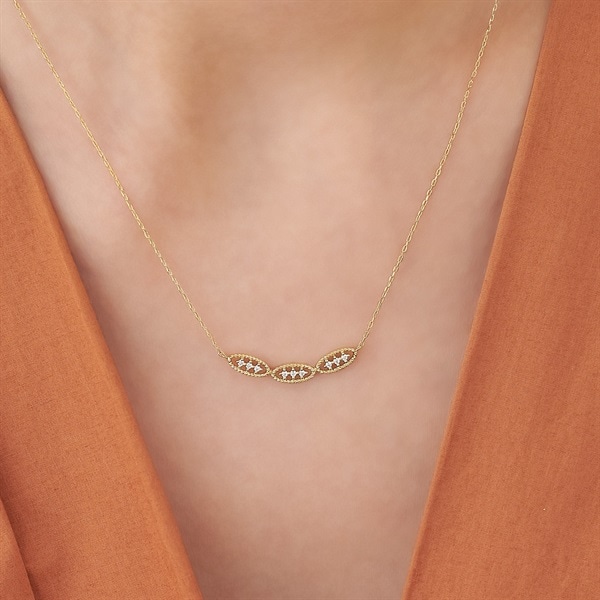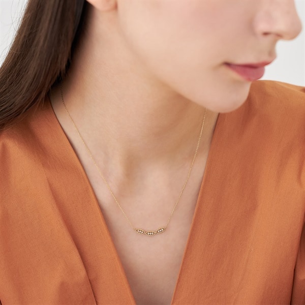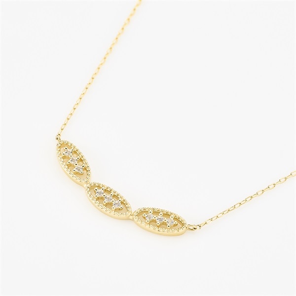 リーフのような透かし模様が美しい横長ネックレス。クラシカルな雰囲気としっかりしたボリュームで、1点でも華やかな輝きを放ちます。ミルグレインの気品ある粒がクラシカルな美しさを際立たせます。ミルグレインとは、ラテン語の「千(ミル)」と「粒(グレイン)」を意味し、途切れなく続く粒の連なりから「永遠の愛」の象徴といわれています。お揃いのリングと合わせれば、より洗練されたコーディネートに。