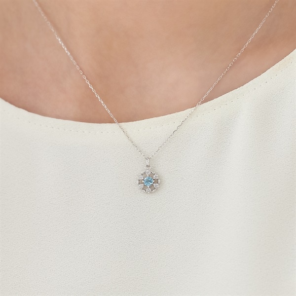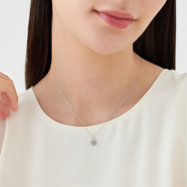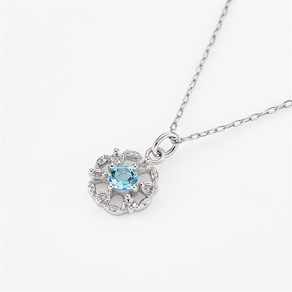 雪の結晶をイメージした繊細なネックレス。澄んだブルーが美しいブルートパーズが、肌の上で凛とした輝きを放ちます。ブルートパーズは「希望」「誠実」を意味します。ミルグレインの気品ある粒がクラシカルな美しさを際立たせます。日常にさり気なく華を添える、特別なデザインはギフトにもおすすめ。※天然石・天然素材を使用しているため、実際の色味や風合いが異なる場合がございます。