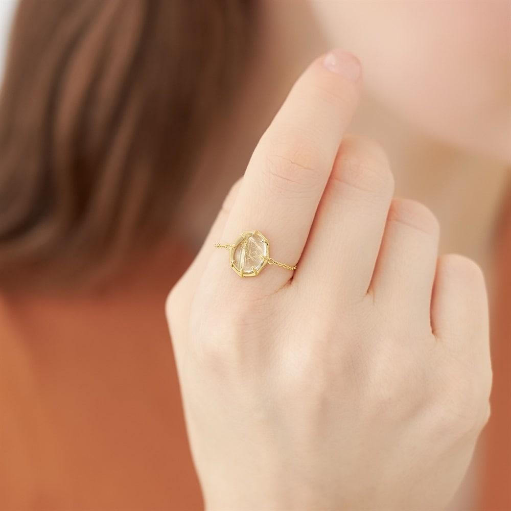 <Voeux Secrets 〜密かな願い〜>胸の奥に秘めた願いを、静かな輝きに変えて。新しい年を彩る希望に満ちたミニコレクション。オーバルのルチルクォーツが印象的なチェーンリング。ローズカットがクラシカルな雰囲気を漂わせ、ひとつひとつ異なる針模様(ゴールドのルチル)が唯一無二の表情を生み出します。石言葉は「金運・強運・家族円満」。サイズフリーで、お好きな指に着けられる万能アイテムです。※天然石・天然素材を使用しているため、実際の色味や風合いが異なる場合がございます。[数量限定ケース付き] なくなり次第終了