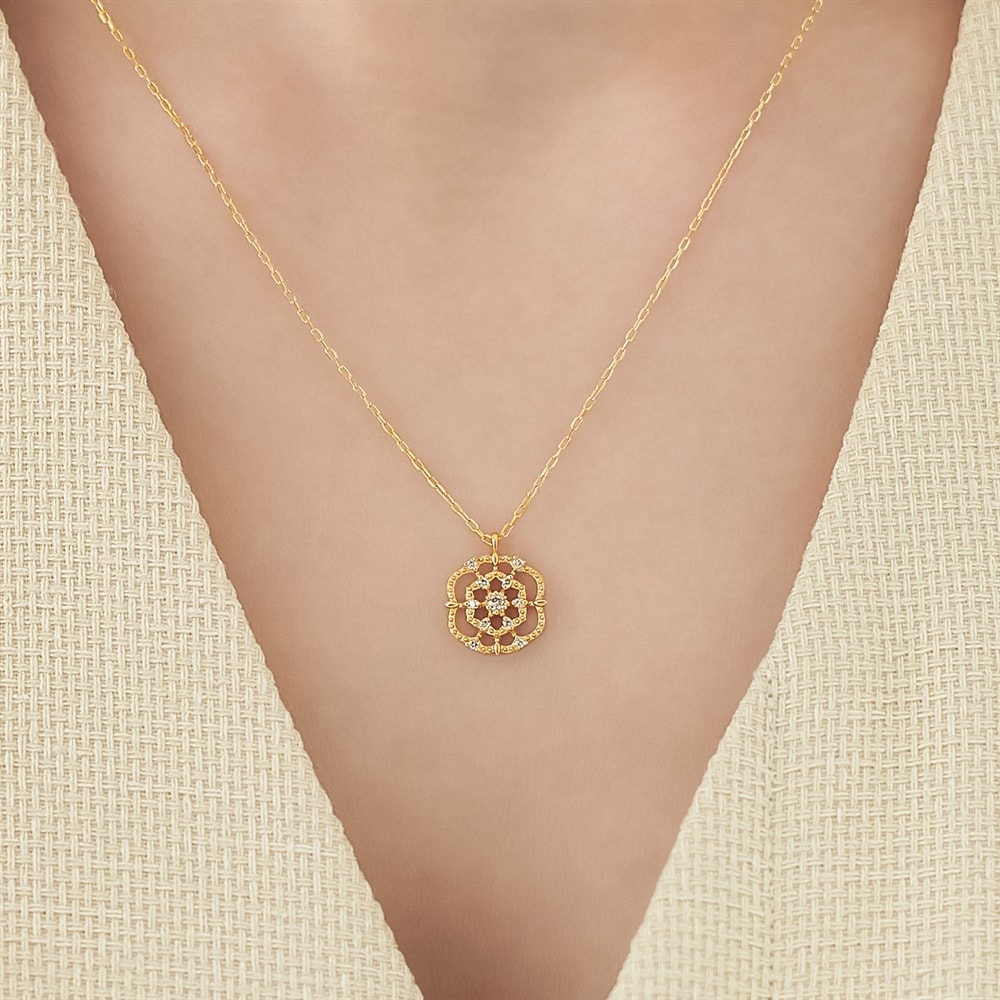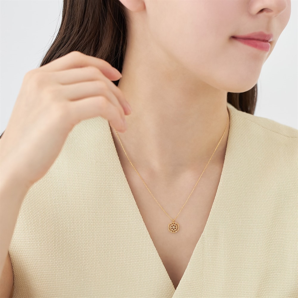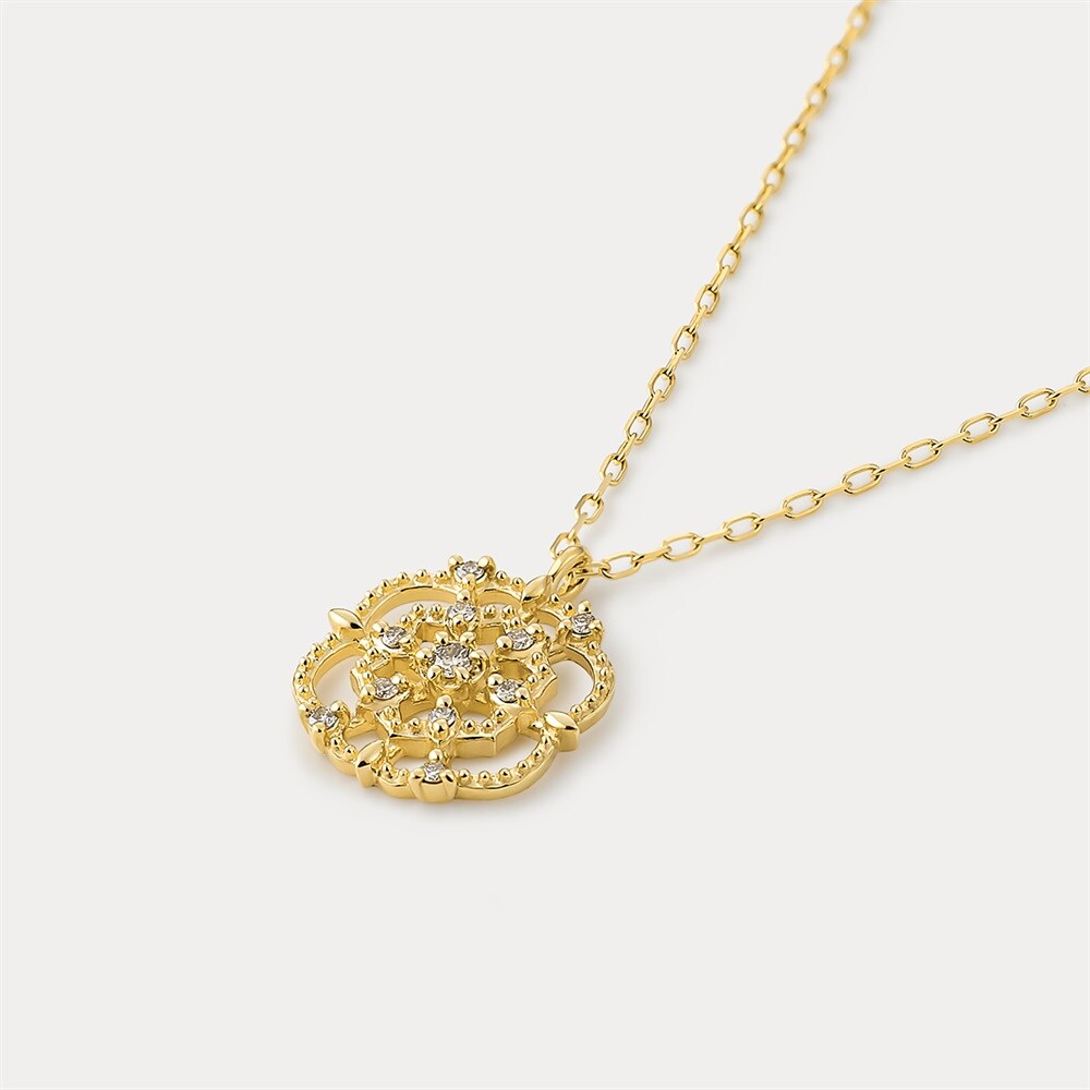 古くから愛されてきた人気のモチーフ「花と葉」を、K18イエローゴールドで表現したペンダントネックレス。透かしのデザインが光をたっぷりと取り込み、ふんだんにあしらったダイヤモンドが繊細に瞬きます。凛とした静かな華やぎが、大人の胸元にやさしく寄り添う上品なネックレスです。※天然石・天然素材を使用しているため、実際の色味や風合いが異なる場合がございます。