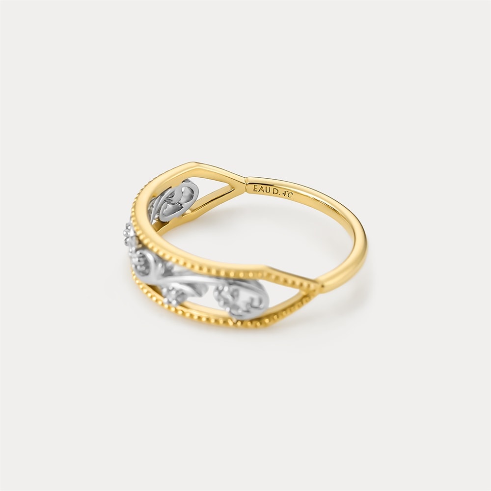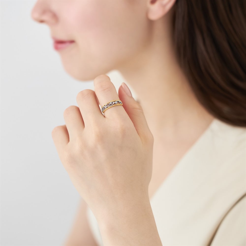 繊細なアラベスク模様を描いたリング。植物のしなやかな曲線美が魅力で、凛とした緊張感とともにひとを惹きつけます。ミルに縁取られたダイヤモンドが洗練された煌めきを添え、静かな存在感を演出。プラチナとK18イエローゴールドのコンビネーションが、贅沢な佇まいで指元に気品をもたらします。※ボリューム(幅)のあるリングは、通常より着用時にサイズが小さく感じる場合がございます。