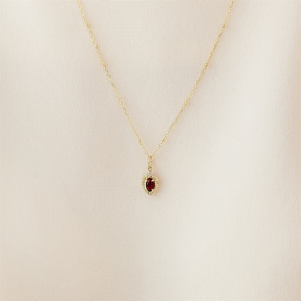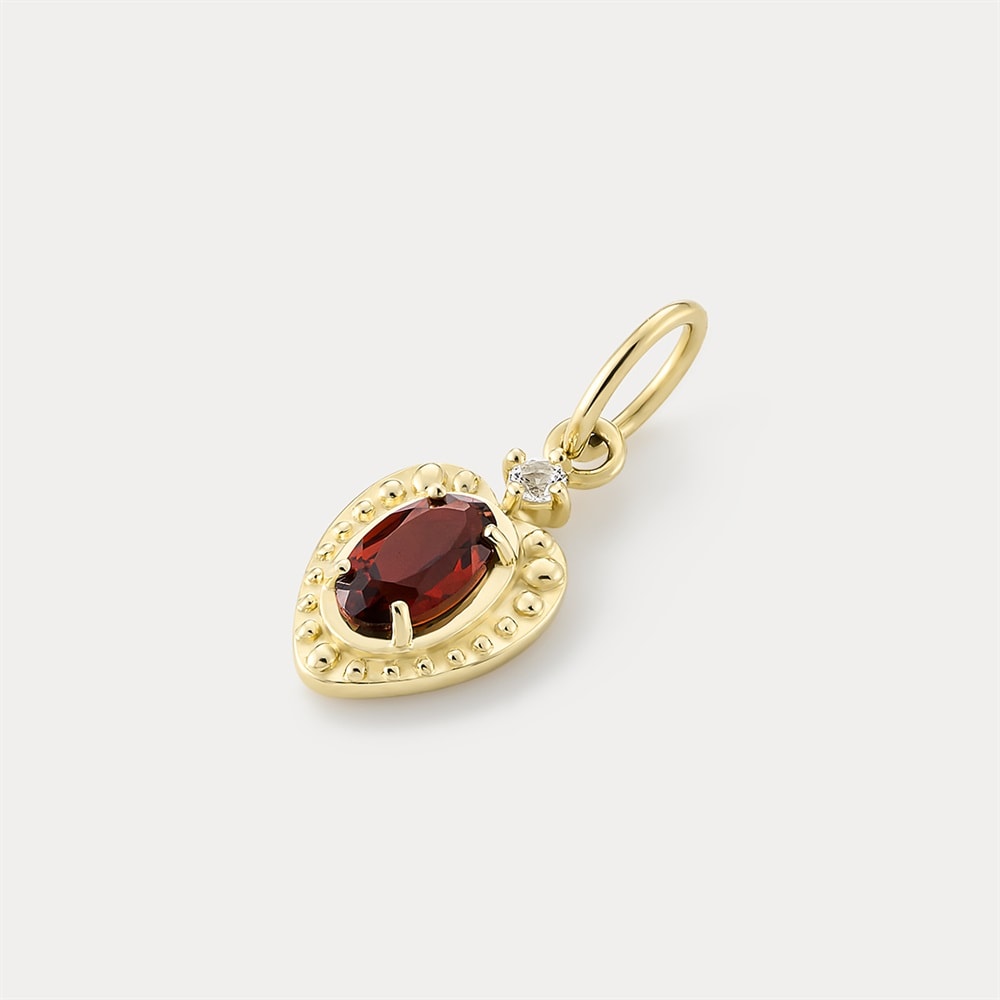 ハートのフォルムに大小のミルをあしらったクラシカルなK10イエローゴールドチャーム。センターで印象的に輝く赤い石はガーネット。華やかさの中に品を感じさせる縦長のハートデザインが甘くなりすぎない表情を演出します。ハートモチーフは古くから「愛・幸福・絆」を象徴するお守りとされ、大切な方への贈り物としてもおすすめです。