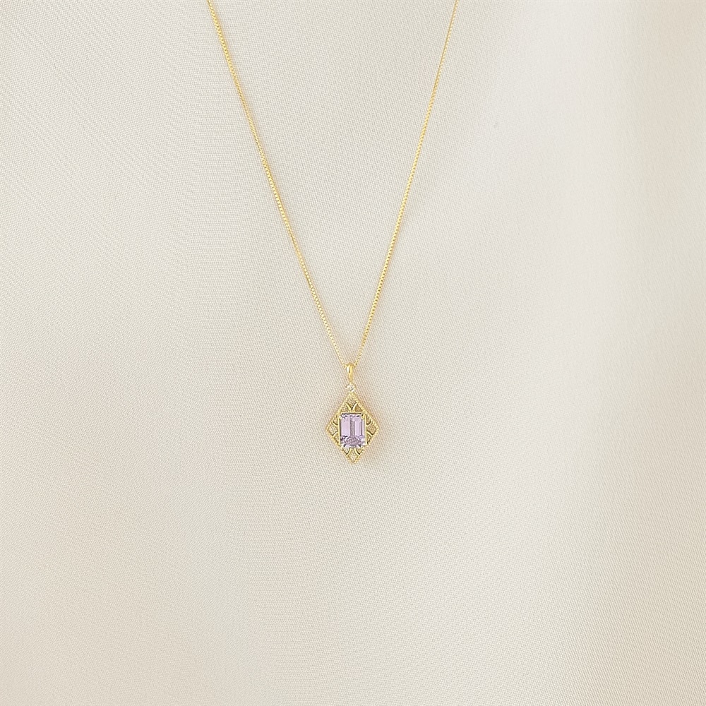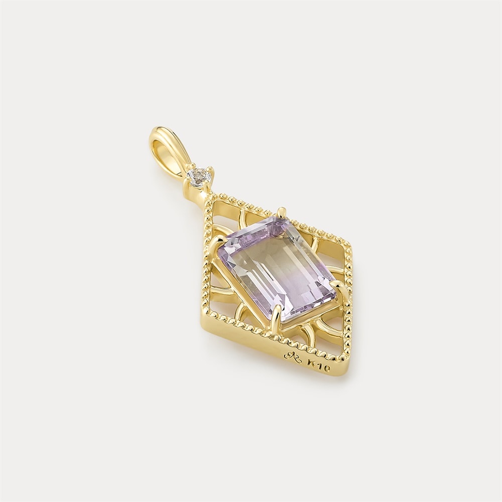 ひし型のシルエットにアメトリンをあしらった、K10イエローゴールドチャーム。ひし形は「子孫繁栄」や「無病息災」といった縁起の良い意味を持つとされ、ミルをほどこした透かしデザインがクラシカルな表情を添えます。程よいボリューム感がありながらも、軽やかな印象に。紫のアメシストと黄色のシトリンが溶け合う、美しいバイカラーを持つアメトリンならではの表情をお楽しみいただけます。