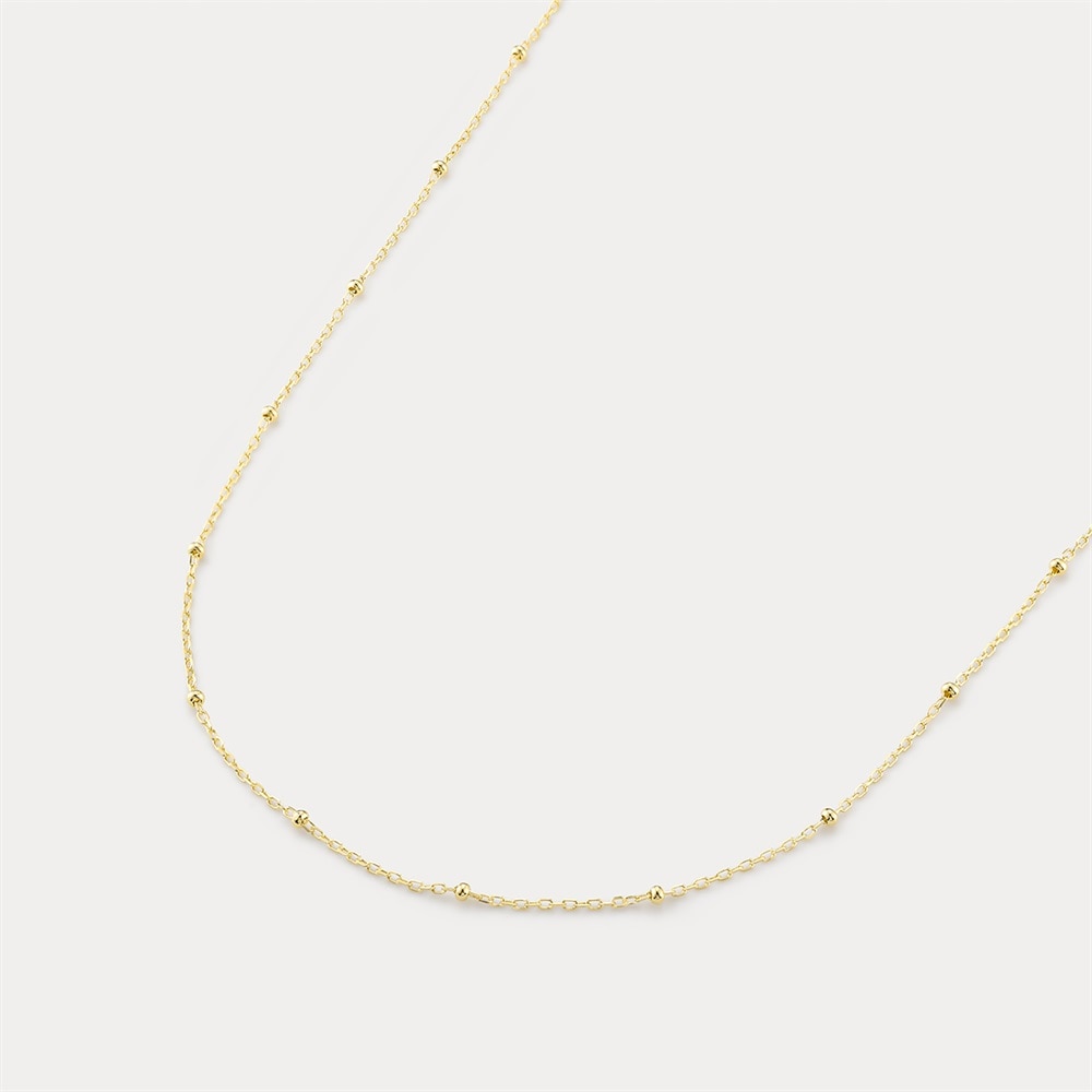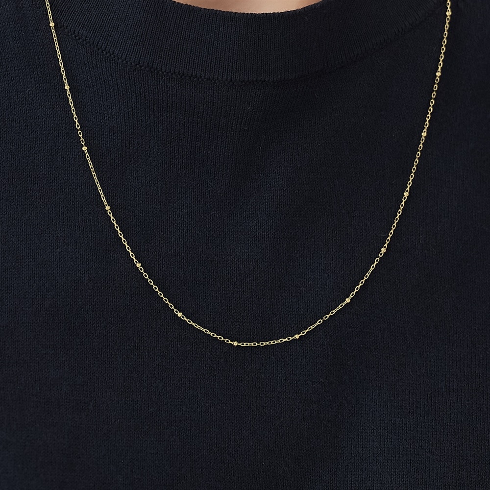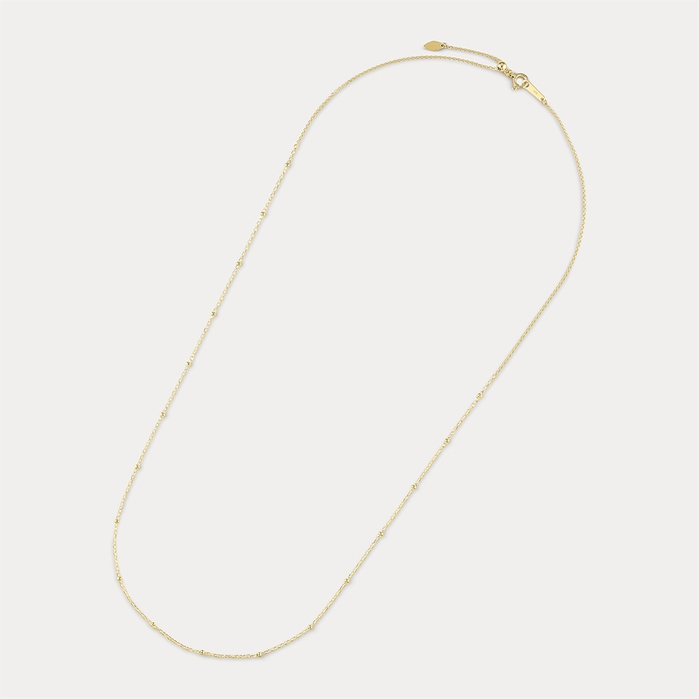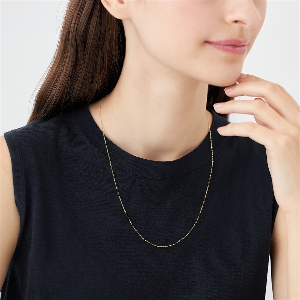 <50cm・K10イエローゴールドチェーンネックレス>小さなドットパーツを配したK10デザインチェーンネックレス。華やかさの中にクラシカルな雰囲気を感じさせる佇まいが魅力です。チャームを通してコーディネートチェーンとしても使え、フリーアジャスター付きで長さ調整も自在。50cmはチェーン単体でもバランスよく楽しめ、チャームを合わせても程よい存在感を演出します。さらにレイヤードスタイルにも取り入れやすく、幅広いアレンジが楽しめる人気の長さです。