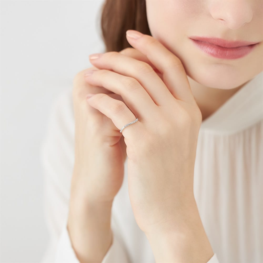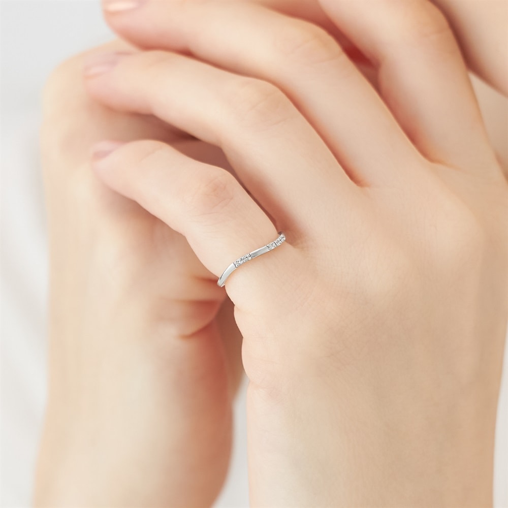 ゆるやかなカーブを描くK10ホワイトのピンキーリング。アシンメトリーに並べたトパーズがさり気ないアクセントとなり、手元に上品な華やぎを添えます。飾り立てずとも上品さが漂うシンプルなアイテムで想いをやさしく届ける場面にも最適です。※ボリューム(幅)のあるリングは、通常より着用時にサイズが小さく感じる場合がございます。