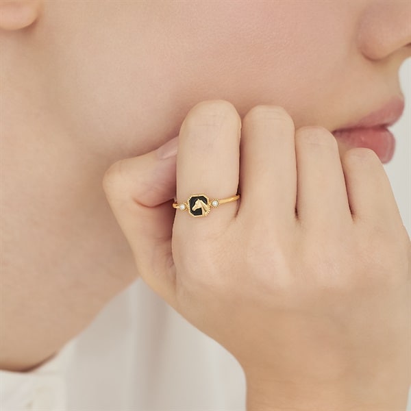 【2026 NEW YEARコレクション】 2026年の干支である馬モチーフのリング。ミニマムサイズの繊細な馬の横顔を、リングにぎゅっと閉じ込めブラックの樹脂で大人っぽい雰囲気に。レイヤードもお楽しみいただけます。 ※天然石・天然素材を使用しているため、実際の色味や風合いが異なる場合がございます。 ※ボリューム(幅)のあるリングは、通常より着用時にサイズが小さく感じる場合がございます。