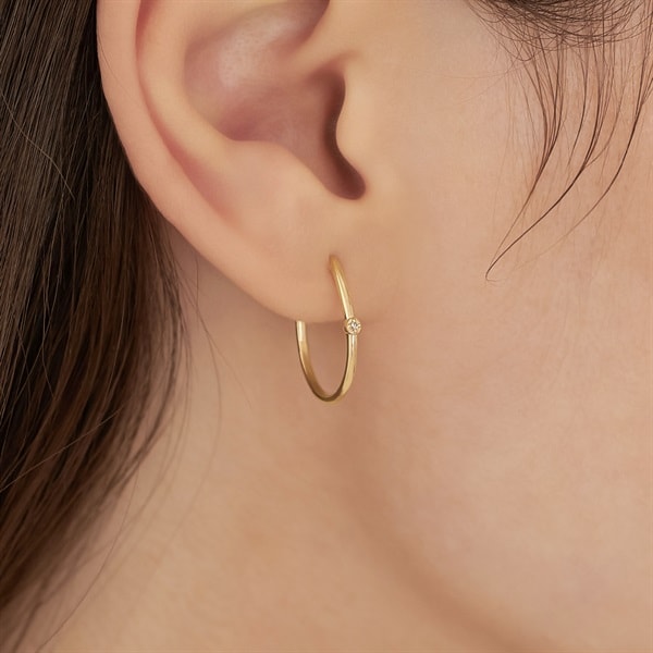 シンプルな1石ダイヤモンドフープピアス。ほどよいボリューム感なので、どんなスタイリングにも自然に馴染みます。大切な方へのギフトにもおすすめです。【ダイヤモンド】地下150~250キロメートルのマグマの中で生まれ、火山の爆発によって地表近くまで押し上げられた鉱物。炭素が隙間なく固くつながりあうことで、高い硬度となっています。その硬さから「永遠の愛の宝石」とも言われています。無色透明なダイヤモンドが一般的ですが、不純物の種類によって黄色~緑~青~ピンクなど様々なバリエーションが見られます。※天然石・天然素材を使用しているため、実際の色味や風合いが異なる場合がございます。