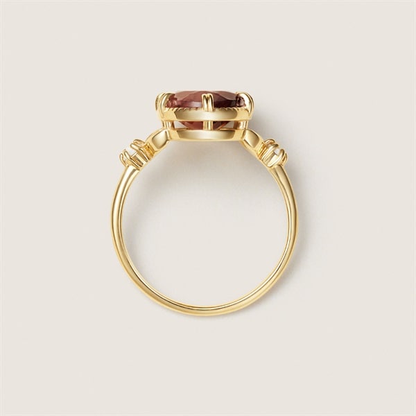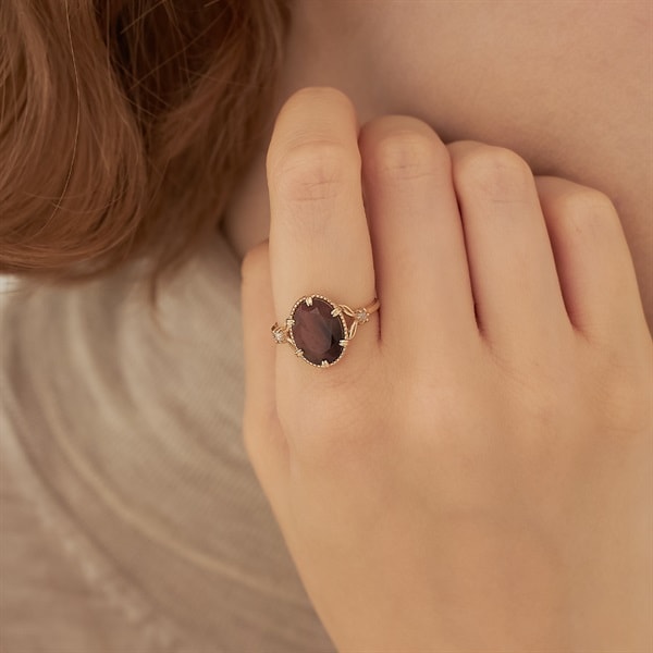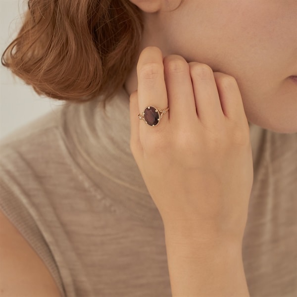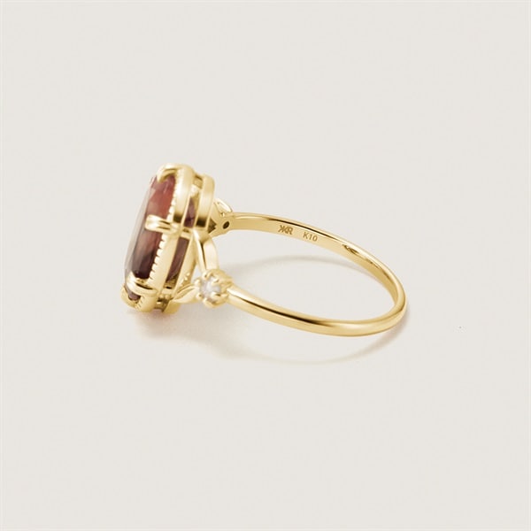 世界にひとつだけの特別なコレクション。神秘的なレッドカラーを持つアンデシンのリング。サイドに留めたローズカットのダイヤモンドがアクセント。ほどよいボリューム感とクラシカルなデザインは、デイリーユースにおすすめです。 【アンデシン】斜長石(フェルスパーの一種)グループに属する宝石。赤やオレンジ、ピンクなど様々な色合いを見せます。1841年にコロンビアの鉱山で初めて発見され、その鉱山にアンデサイト溶岩がたくさんあったことから名づけられました。原産地のひとつであるチベットでは、古くから聖なる石として聖職者が儀式やお守りとして用いられたとされています。※こちらは一点物の商品です。※画像のジュエリーそのものを発送いたしますが天然石・天然素材を使用しているため、実際の色味や風合いが異なる場合がございます。※ボリューム(幅)のあるリングは、通常より着用時にサイズが小さく感じる場合がございます。