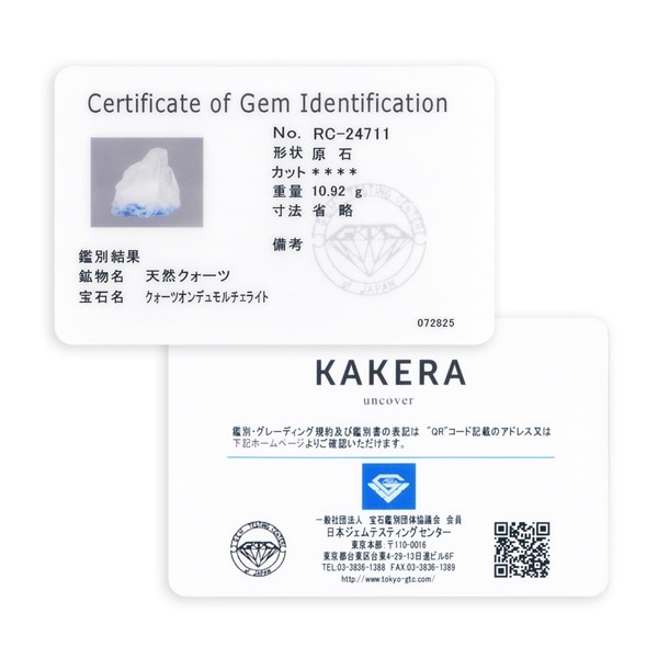 KAKERAが厳選した鉱物「STONE GALLERY」コレクション。 【クォーツ】和名は「石英」と呼ばれ、スラブ語の「tward(硬い)」が語源の、地殻から産出される最もポピュラーな鉱物のひとつです。古来では、クォーツは神が創造した氷であると考えられていました。透明度の高い石英はロッククリスタル(水晶)と呼ばれ、アメジストやローズクォーツなどの色に合わせた宝石名がついています。このクォーツは、青色から濃紫色に見えるホウ素を含んだアルミニウム珪酸塩鉱物であるデュモルチェライトと共生しています。 ※こちらは一点物の商品です。 ※鑑定カード・オリジナル専用ケースが付属します。 ※画像の鉱物そのものを発送いたしますが、天然石のため実際の色味や風合いが異なる場合がございます。