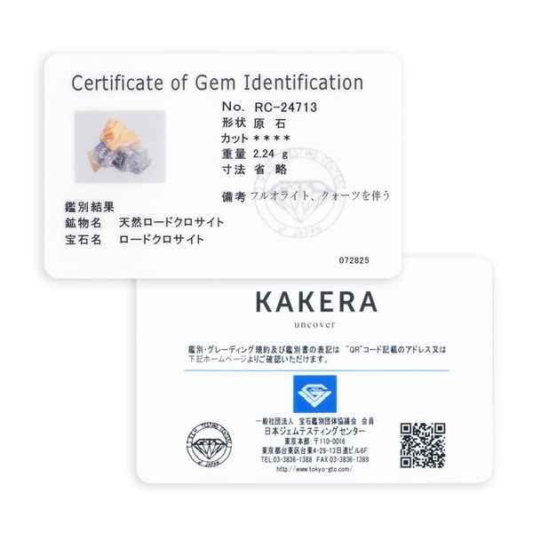 KAKERAが厳選した鉱物「STONE GALLERY」コレクション。 【ロードクロサイト】1940年頃から市場に出た、比較的新しい宝石。美しいピンク色を持つことから、ギリシャ語で「rhodes(バラ)」と「chros(色)」が由来とされています。赤とピンクの縞模様を持つ石は「インカローズ」と呼ばれています。かつては日本でも産出され、北海道に有名な鉱山がありました。硬度が低くへき開性が強いので扱いに注意が必要です。 ※こちらは一点物の商品です。 ※鑑定カード・オリジナル専用ケースが付属します。 ※画像の鉱物そのものを発送いたしますが、天然石のため実際の色味や風合いが異なる場合がございます。