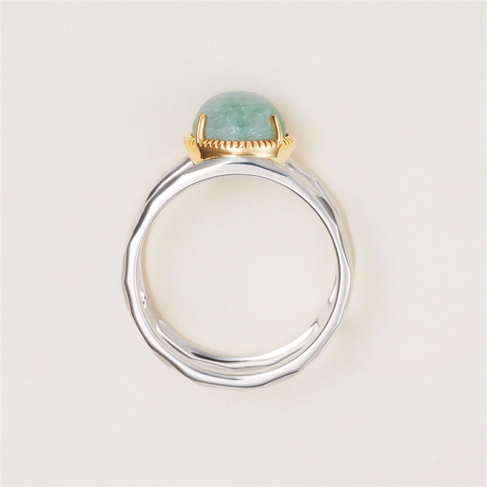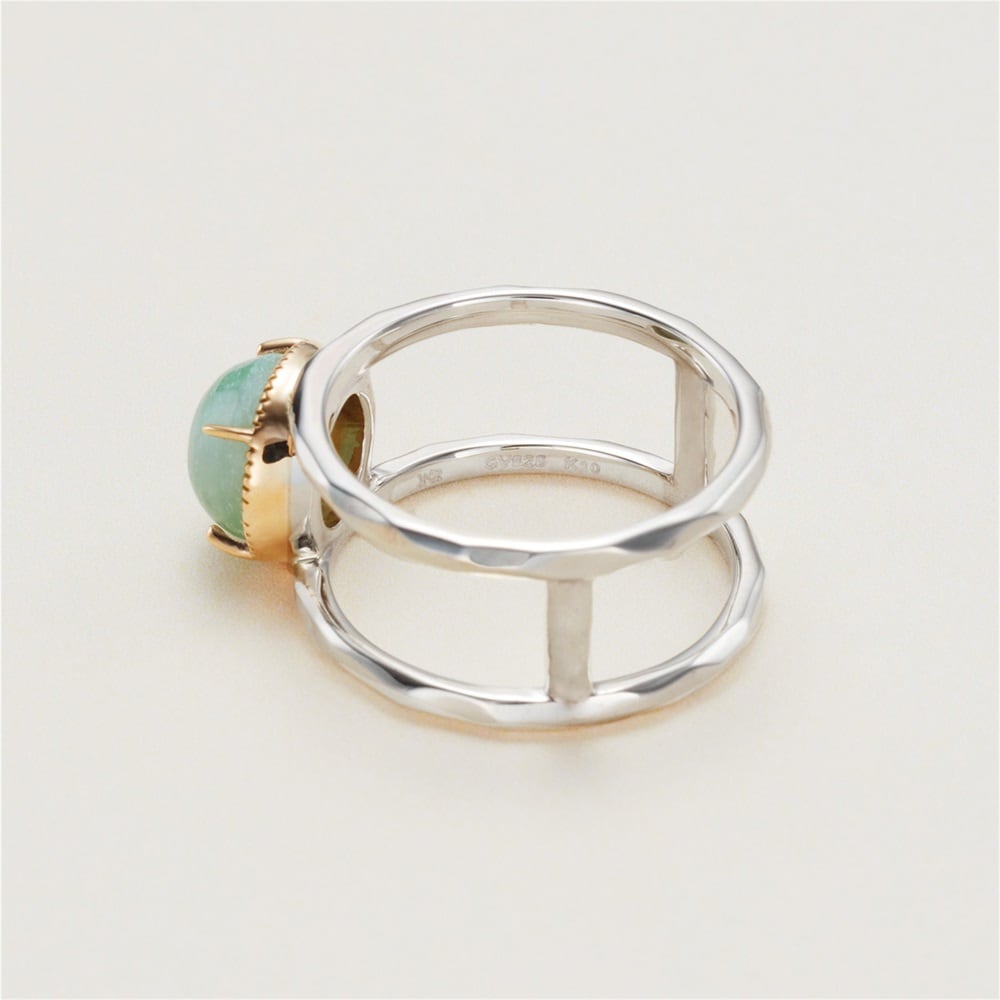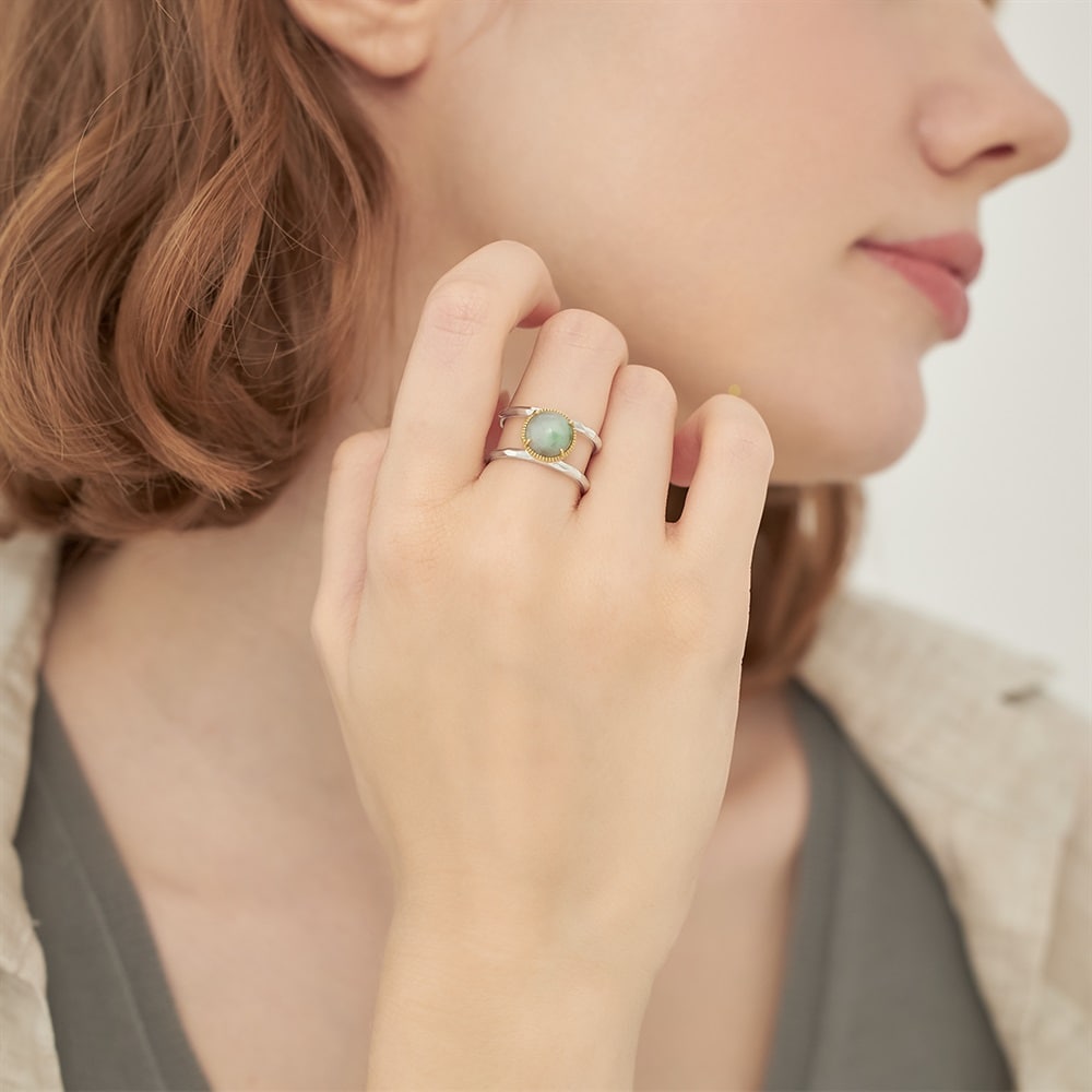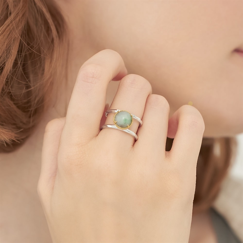 淡いグリーンカラーの翡翠コンビリング。繊細なミル打ちとクラフト感のあるアームは、カジュアルなスタイリングにも馴染みやすいデザインです。翡翠を初めて身に着ける方にもおすすめです。