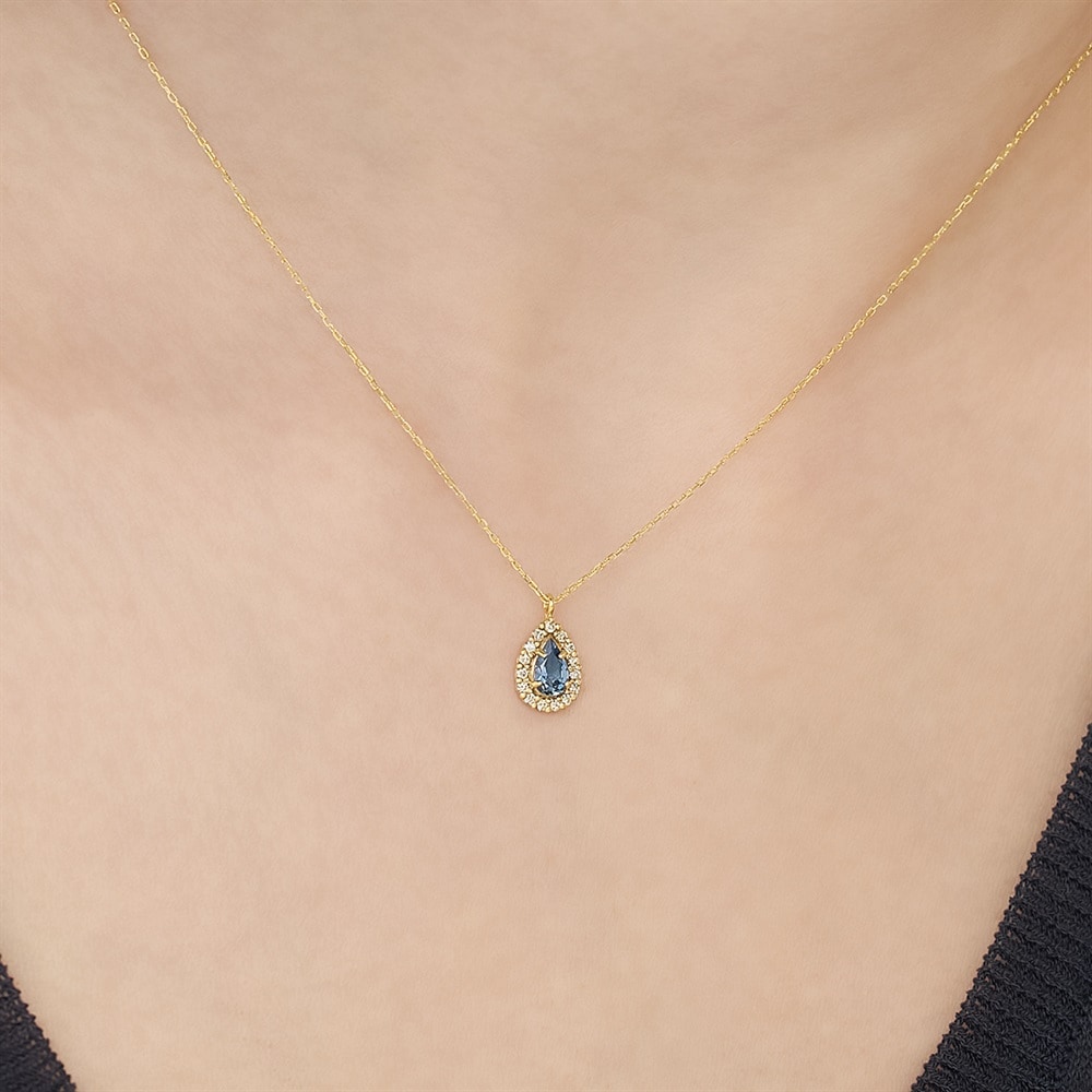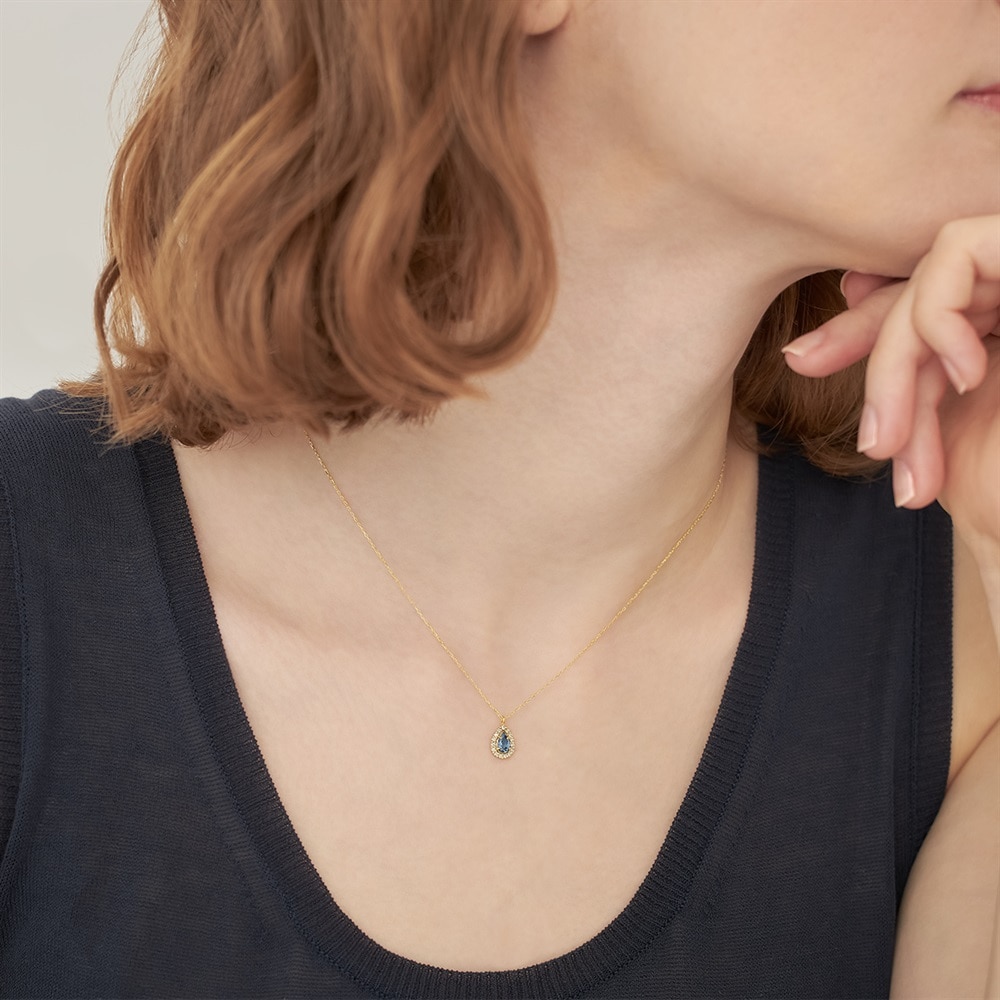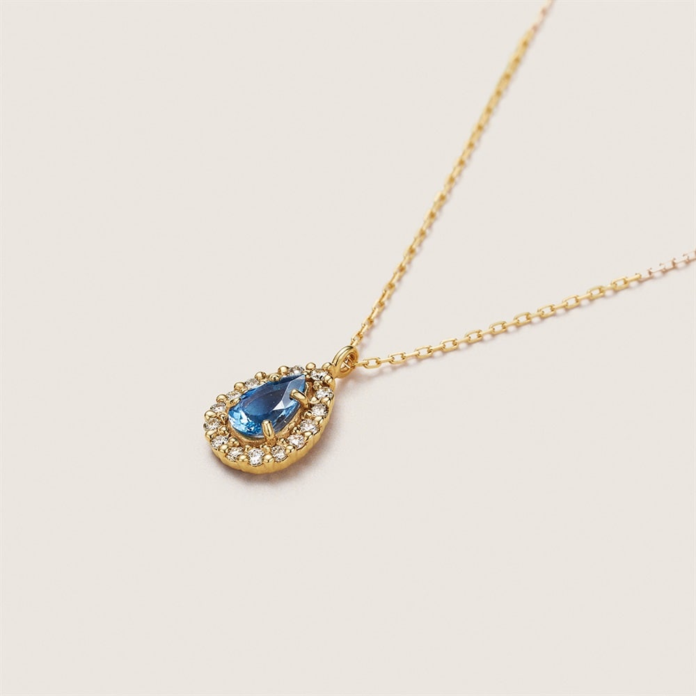 濃いブルーが特徴の「サンタマリアカラー」のアクアマリンネックレス。デコルテがぱっと華やぐようなビビットカラーが魅力です。ダイヤモンドの取り巻きをほどこし、リュクスな印象に。大切な方へのギフトにもおすすめです。