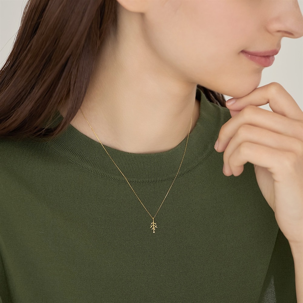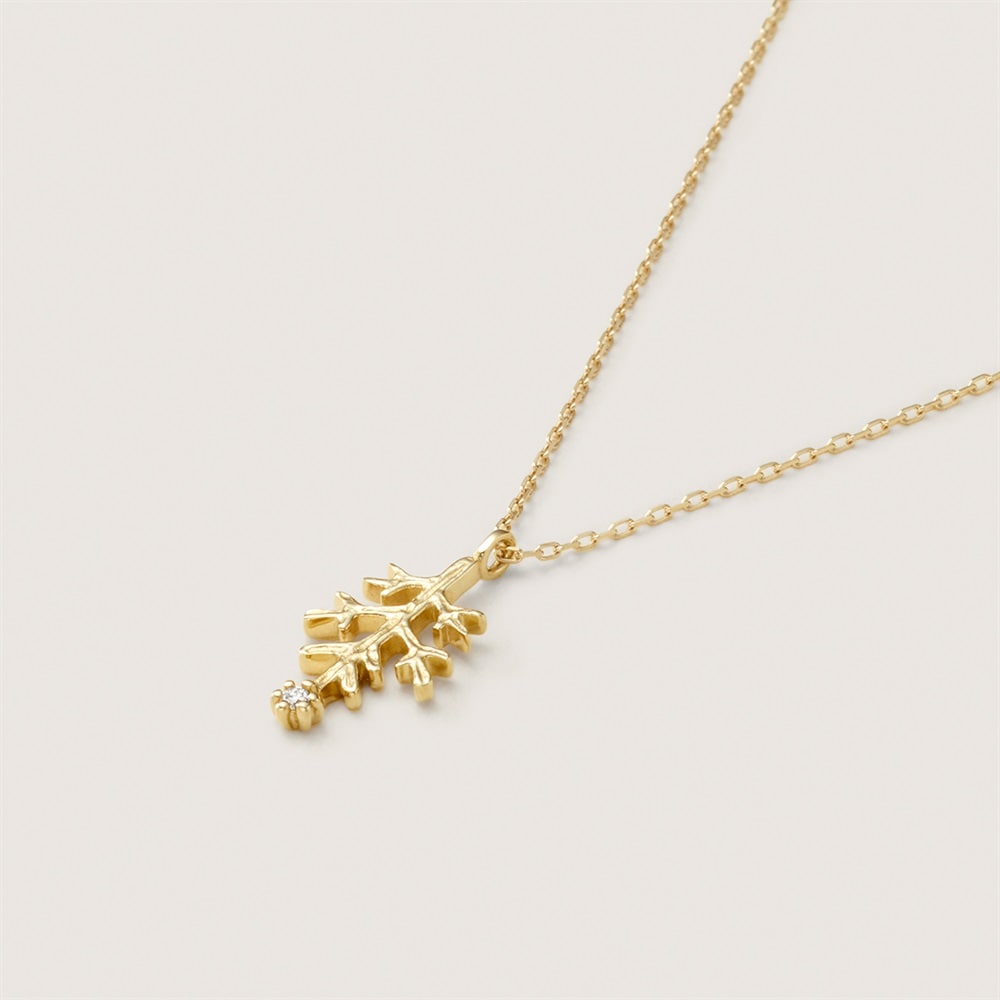 シロタエギクがモチーフのイエローゴールドネックレス。葉の表情を、繊細な彫りで表現しています。1石留めたダイヤモンドがアクセントに。さり気なくスタイリングにモチーフを取り入れたい方におすすめです。※天然石・天然素材を使用しているため、実際の色味や風合いが異なる場合がございます。