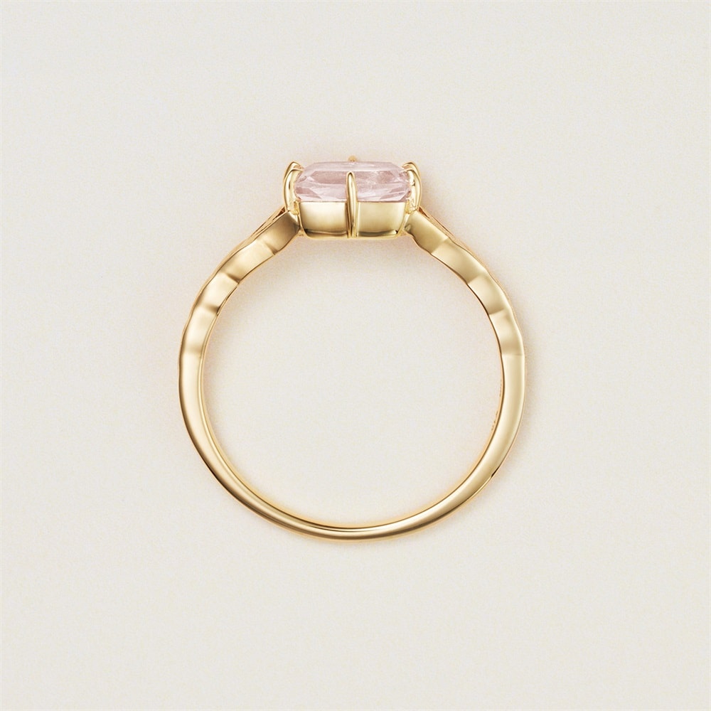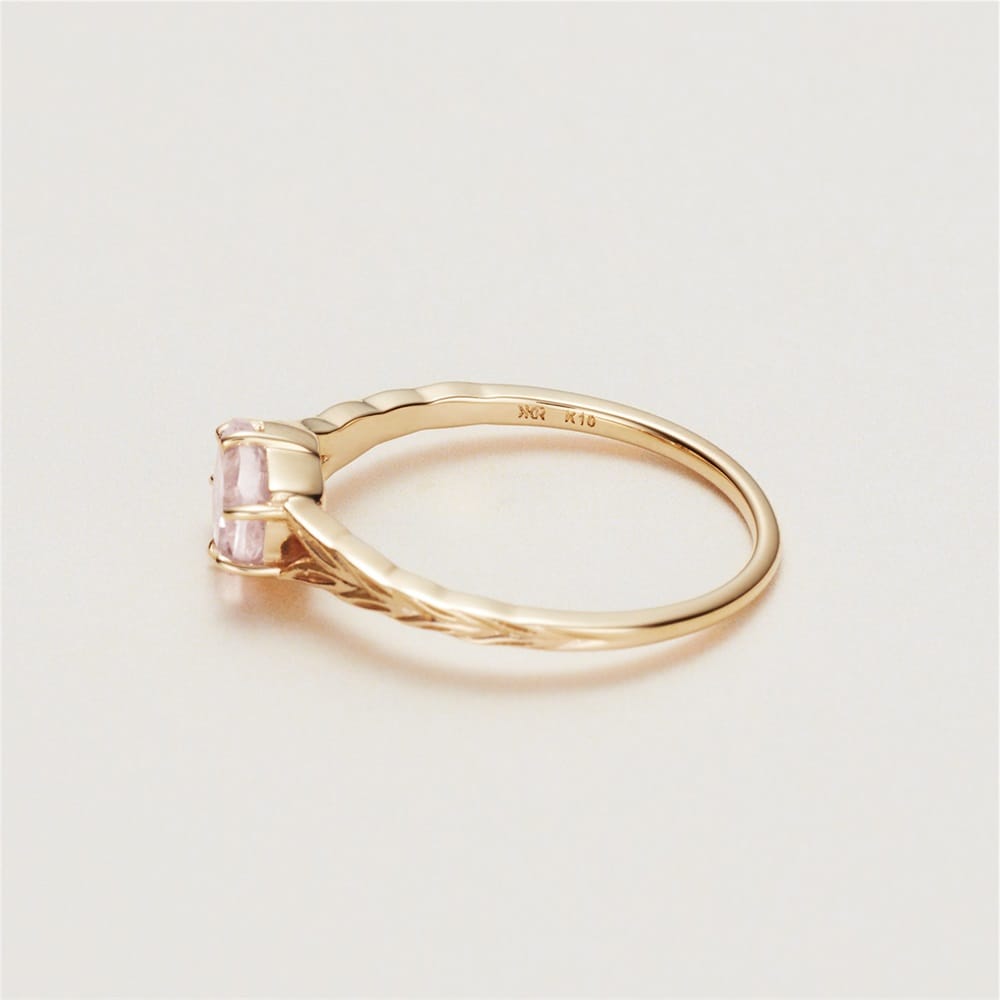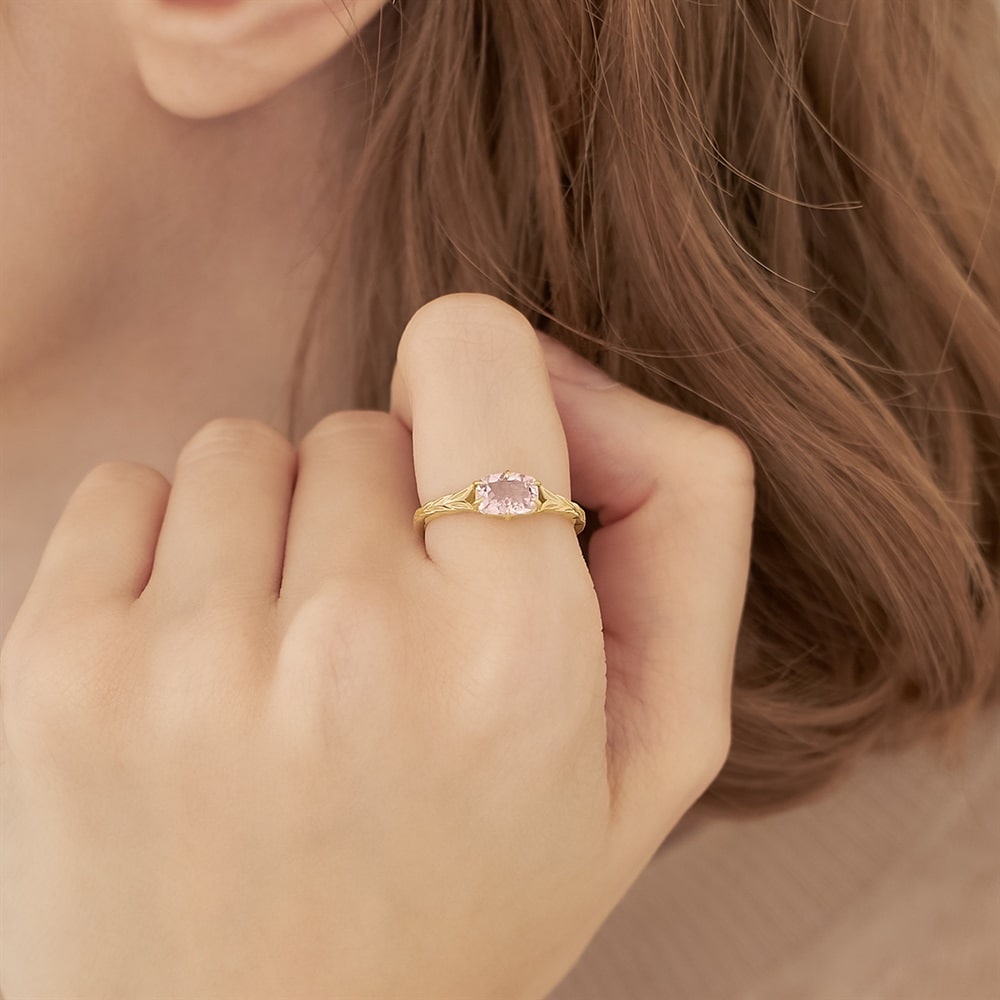 淡いピンクカラーが可愛らしいモルガナイトリング。繊細なリーフ模様をアームにほどこしクラシカルな印象に。1本でもレイヤードでも着けやすいボリューム感です。大切な方へのギフトにもおすすめです。【モルガナイト】アクアマリンやエメラルドと同じ「ベリル」という鉱物の一種。微量のマンガンやセシウムによりピンク色に発色するものをモルガナイトと呼びます。宝石学者G・F・クンツの提案により、宝石コレクターでありクンツの後継者であるジョン・P・モルガンに敬意を表してモルガナイトと名付けられました。オレンジを帯びたものより、ピンクの色合いが強いものが高価とされています。※天然石・天然素材を使用しているため、実際の色味や風合いが異なる場合がございます。※ボリューム(幅)のあるリングは、通常より着用時にサイズが小さく感じる場合がございます。