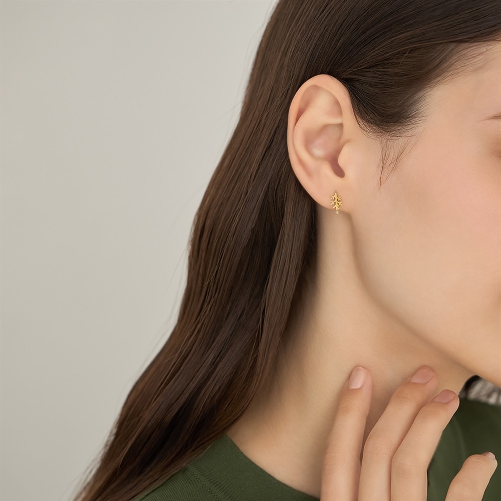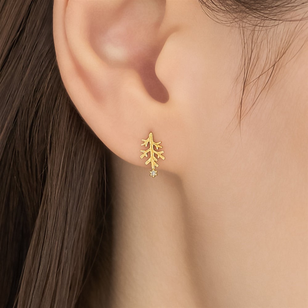 シロタエギクがモチーフのイエローゴールドピアス。葉の表情を、繊細な彫りで表現しています。1石留めたダイヤモンドがアクセントに。さり気なくスタイリングにモチーフを取り入れたい方におすすめです。※天然石・天然素材を使用しているため、実際の色味や風合いが異なる場合がございます。