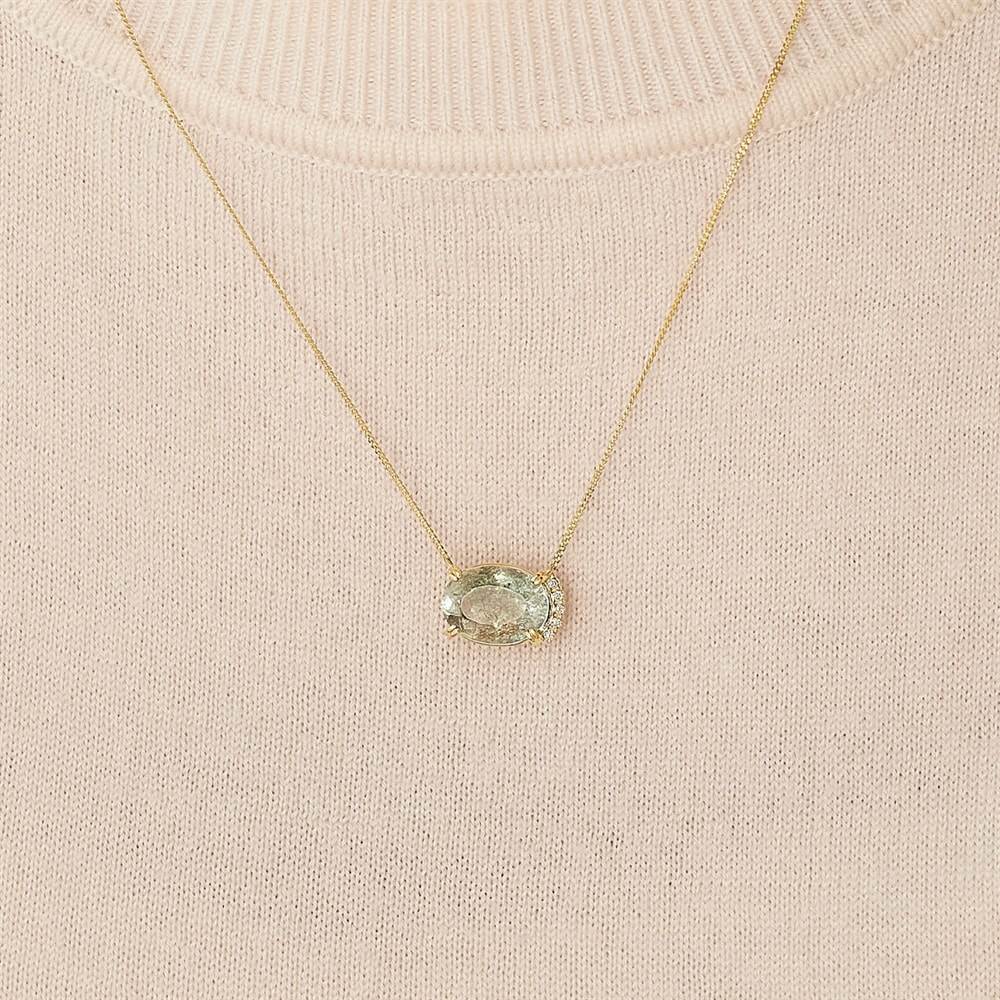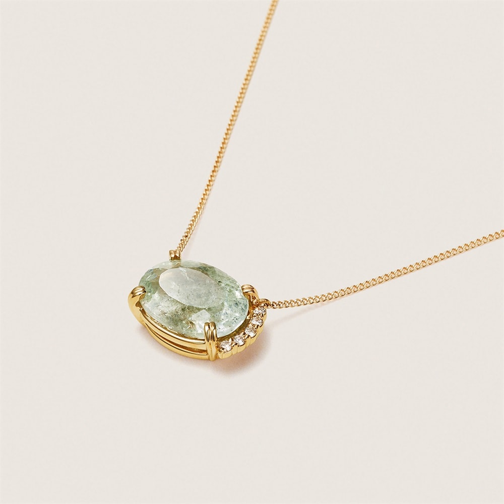 苔のような内包物が特徴のモスアクアマリンとダイヤモンドのボリューミーなネックレス。ナチュラルなブルーグリーンカラーは、どんなスタイリングにも馴染むのでデイリージュエリーとしておすすめです。1本でスタイリングのアクセントになるアイテムです。【アクアマリン】ラテン語で「水」を意味する「aqua(アクア)」と「海」を意味する「marine(マリン)」から名付けられた鉱物名「ベリル」の一種。明るい場所と暗い場所によって色味が変わることから、中世ヨーロッパでは夜会用の宝石として人気があったと言われています。名前通り、海の波を落ち着かせる石と信じられ、航海のお守りとして海兵が身に着けていたというエピソードもあります。※こちらは一点物の商品です。※画像のジュエリーそのものを発送いたしますが天然石・天然素材を使用しているため、実際の色味や風合いが異なる場合がございます。
