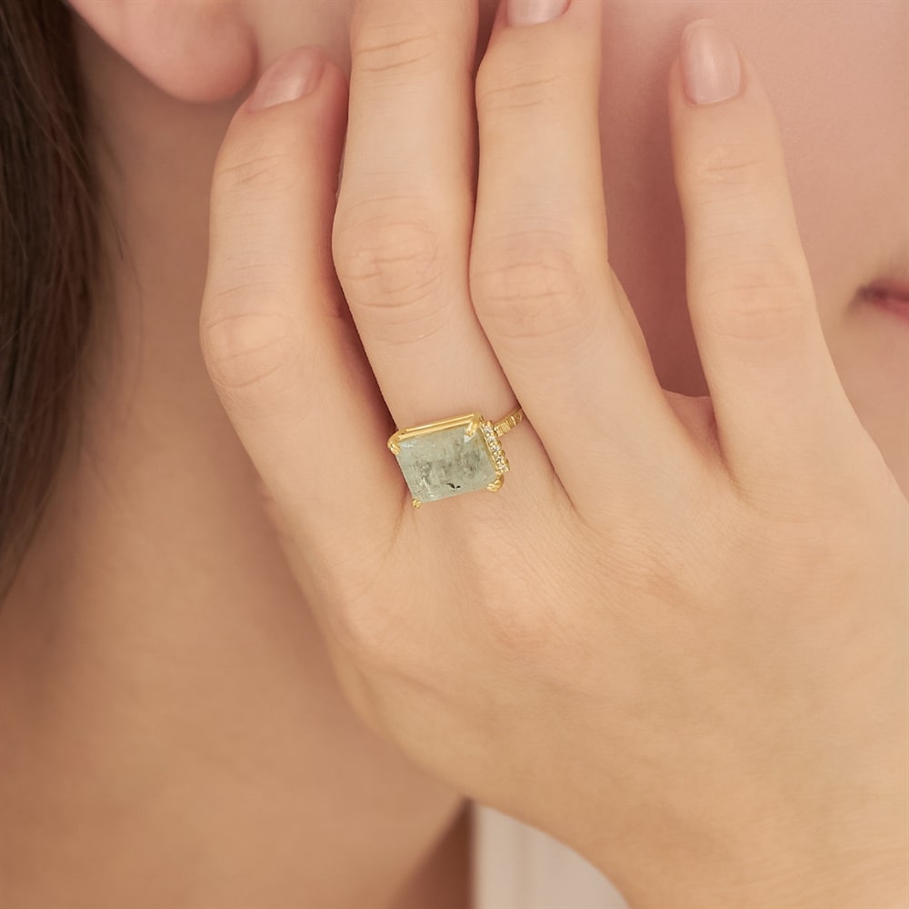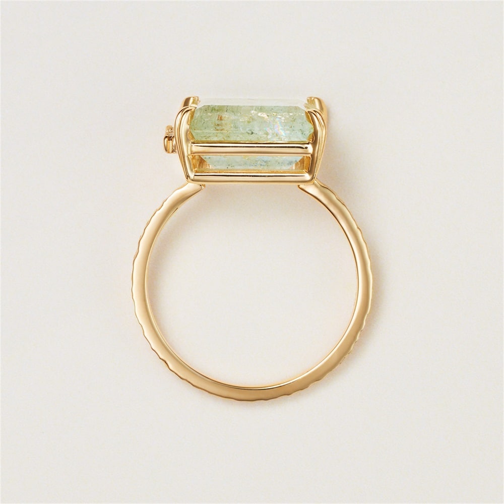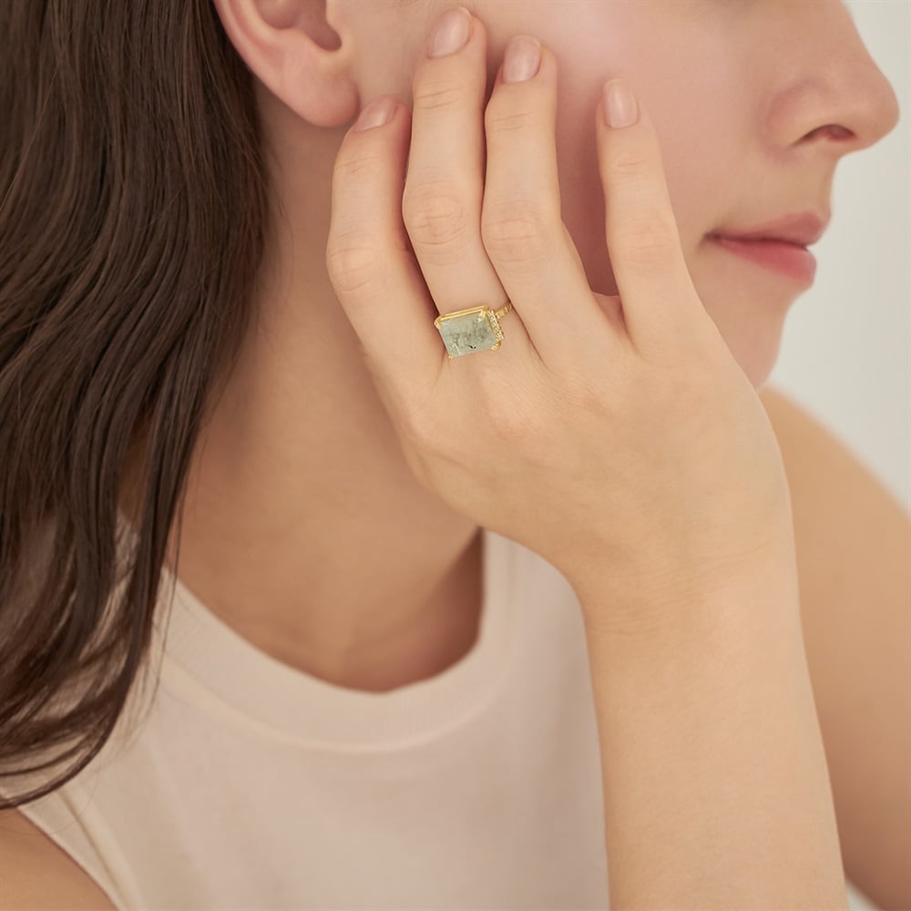 苔のような内包物が特徴のモスアクアマリンとダイヤモンドのボリューミーなリング。アームには細かなテクスチャーをほどこし、クラフト感のあるデザインにしています。1本でスタイリングのアクセントになるリングです。【アクアマリン】ラテン語で「水」を意味する「aqua(アクア)」と「海」を意味する「marine(マリン)」から名付けられた鉱物名「ベリル」の一種。明るい場所と暗い場所によって色味が変わることから、中世ヨーロッパでは夜会用の宝石として人気があったと言われています。名前通り、海の波を落ち着かせる石と信じられ、航海のお守りとして海兵が身に着けていたというエピソードもあります。※こちらは一点物の商品です。※画像のジュエリーそのものを発送いたしますが天然石・天然素材を使用しているため、実際の色味や風合いが異なる場合がございます。※ボリューム(幅)のあるリングは、通常より着用時にサイズが小さく感じる場合がございます。