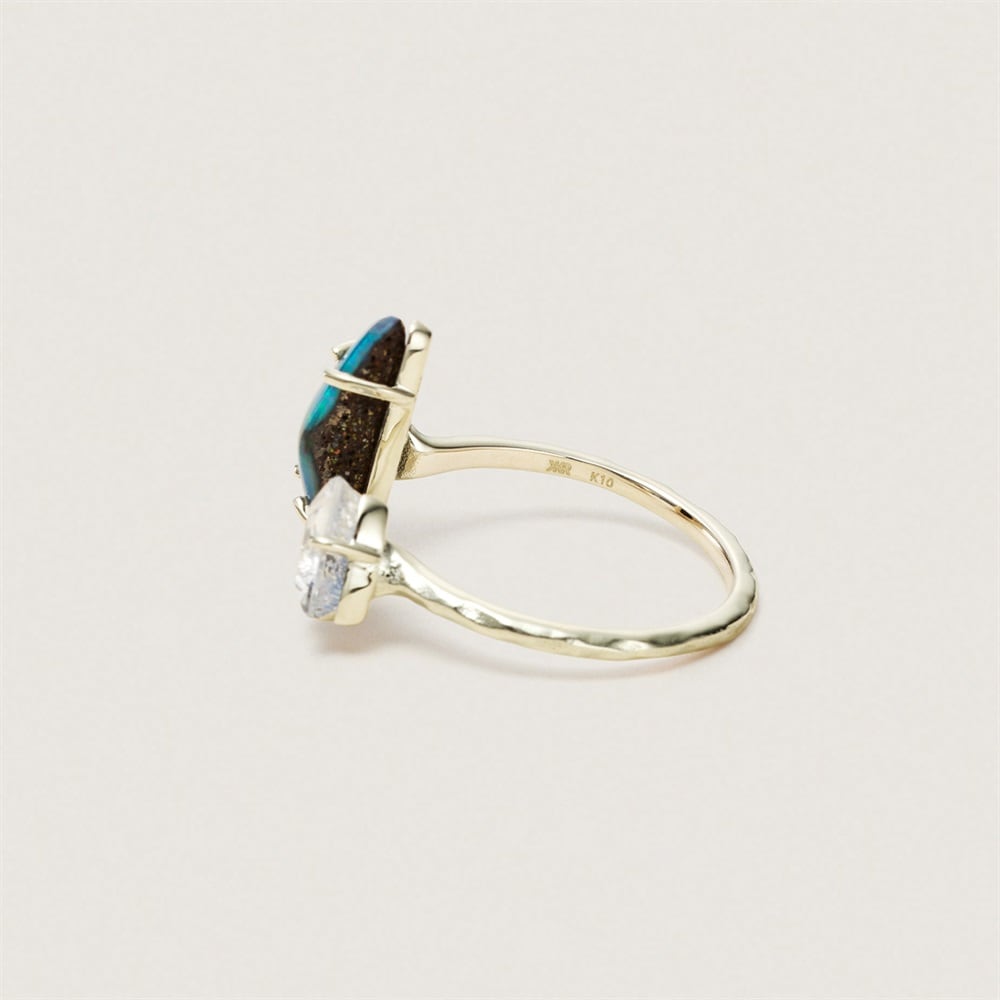 世界にひとつだけの特別なコレクション。デュモルチェライトという青色の鉱物が内包されたクォーツ(デュモルチェライトインクォーツ)と母岩付きのオパール(ボルダーオパール)のリング。石の魅力を最大限に引き出すため、シンプルでミニマムなデザインに。クラフト感のある表情は、デイリーユースにおすすめです。【クォーツ】和名は「石英」と呼ばれ、スラブ語の「tward(硬い)」が語源の、地殻から産出される最もポピュラーな鉱物のひとつです。古来では、クォーツは神が創造した氷であると考えられていました。透明度の高い石英はロッククリスタル(水晶)と呼ばれ、アメシストやローズクォーツなどの色に合わせた宝石名がついています。※デュモルチェライトインクォーツは含侵処理を施しています。※こちらは一点物の商品です。※画像のジュエリーそのものを発送いたしますが天然石・天然素材を使用しているため、実際の色味や風合いが異なる場合がございます。※ボリューム(幅)のあるリングは、通常より着用時にサイズが小さく感じる場合がございます。