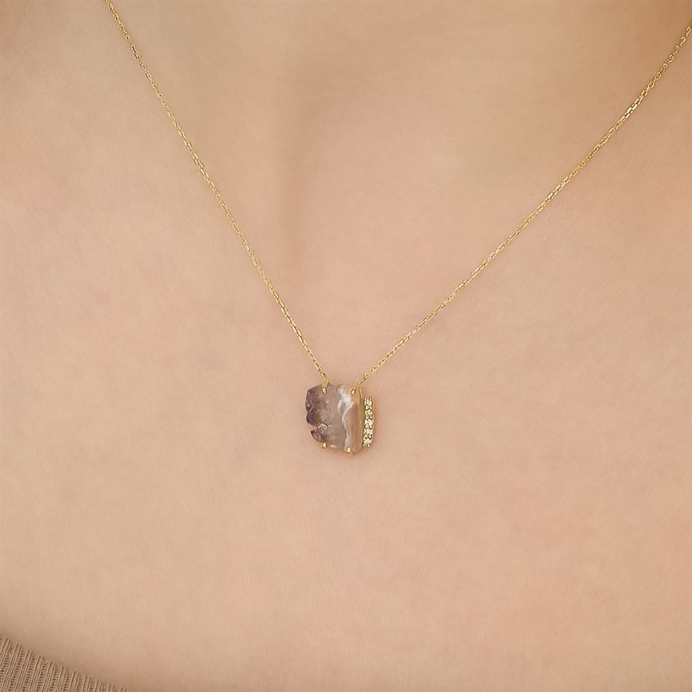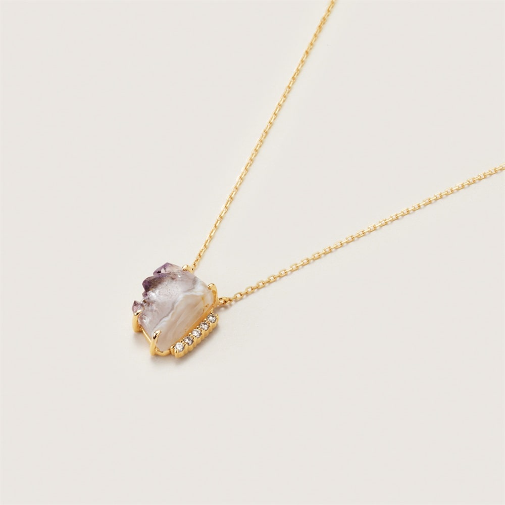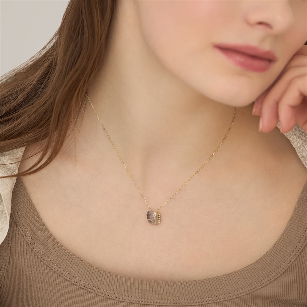 世界にひとつだけの特別なコレクション。 ナチュラルなフォルムのアゲートネックレス。一点物ならではの個性あふれるアゲートを、デザインを削ぎ落したシンプルな台座に留めました。パープルのグラデーションとダイヤモンドの輝きが美しくデコルテを華やかに彩ります。肌馴染みがよく、デイリーにお使いいただけるアイテムです。 【アゲート】特有の縞模様を持つ鉱物で、水晶と同じ「石英」のカテゴリーに入ります。和名は「めのう」。古来より世界中で産出され、加熱処理加工や染色加工をほどこし、装飾品等に使用されてきました。ローマ時代には、アゲートのインタリオを使用したシグネットリングが流行しました。 ※こちらは一点物の商品です。 ※画像のジュエリーそのものを発送いたしますが天然石・天然素材を使用しているため、実際の色味や風合いが異なる場合がございます。