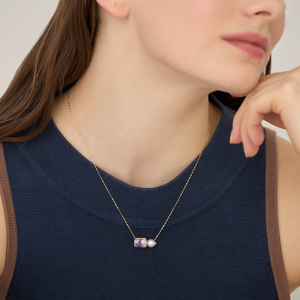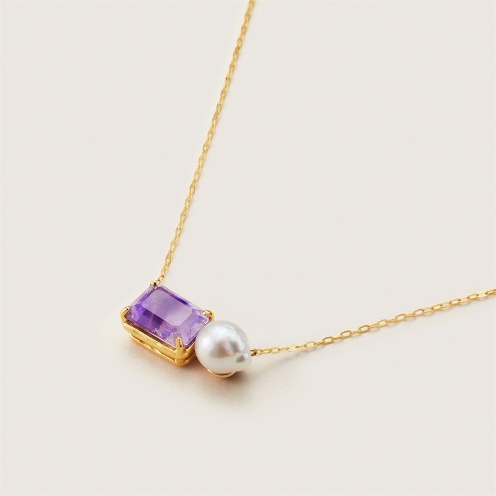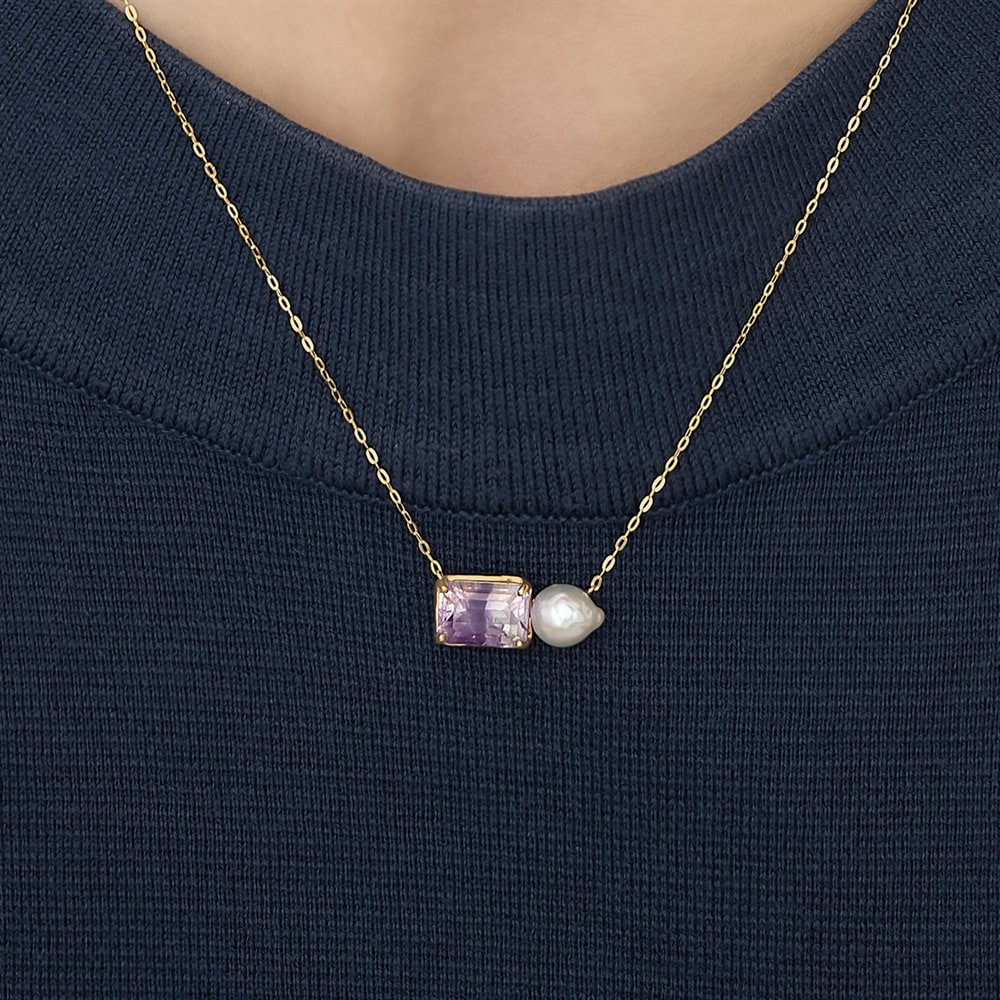 世界にひとつだけの特別なコレクション。 バイカラークォーツとバロックパールのネックレス。美しいパープルのグラデーションの中に、繊細なインクルージョンが目を引く希少性の高いクォーツを留めています。クラフト感のあるフォルムは、デイリーユースにおすすめです。 【クォーツ】和名は「石英」と呼ばれ、スラブ語の「tward(硬い)」が語源の、地殻から産出される最もポピュラーな鉱物のひとつです。古来では、クォーツは神が創造した氷であると考えられていました。透明度の高い石英はロッククリスタル(水晶)と呼ばれ、アメシストやローズクォーツなどの色に合わせた宝石名がついています。 ※こちらは一点物の商品です。 ※画像のジュエリーそのものを発送いたしますが天然石・天然素材を使用しているため、実際の色味や風合いが異なる場合がございます。