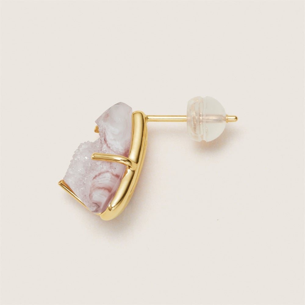 世界にひとつだけの特別なコレクション。 ナチュラルなフォルムのアゲートピアス。一点物ならではの個性あふれるアゲートを、デザインを削ぎ落したシンプルな台座に留めました。パープルのグラデーションが美しく、耳元を華やかに彩ります。肌馴染みがよく、デイリーにお使いいただけるアイテムです。 【アゲート】特有の縞模様を持つ鉱物で、水晶と同じ「石英」のカテゴリーに入ります。和名は「めのう」。古来より世界中で産出され、加熱処理加工や染色加工をほどこし、装飾品等に使用されてきました。ローマ時代には、アゲートのインタリオを使用したシグネットリングが流行しました。 ※こちらは一点物の商品です。 ※画像のジュエリーそのものを発送いたしますが天然石・天然素材を使用しているため、実際の色味や風合いが異なる場合がございます。