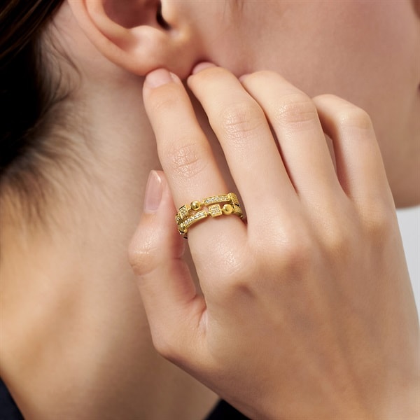 【GÉOMÉTRIQUE〜ジオメトリック〜】パリの建築美やアートを感じさせる幾何学モチーフ。大胆な造形と上質な輝きが響き合う、都会的なコレクション。ランダムに配置された幾何学のシルエットが印象的なリング。ボリューム感とダイヤモンドの繊細な煌めきが手元を華やかに彩ります。それだけで手元をラグジュアリーに演出する特別な一本です。※ボリューム(幅)のあるリングは、通常より着用時にサイズが小さく感じる場合がございます。品番:122541133101 ブレスレットはこちら >店舗一覧はこちら >※こちらの商品は、銀座三越店・日本橋三越店・横浜タカシマヤ店・阪急うめだ本店の4店舗のみの取り扱いとなります。詳細は店舗へ直接お問い合わせください。
