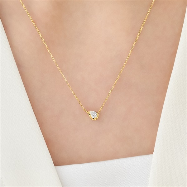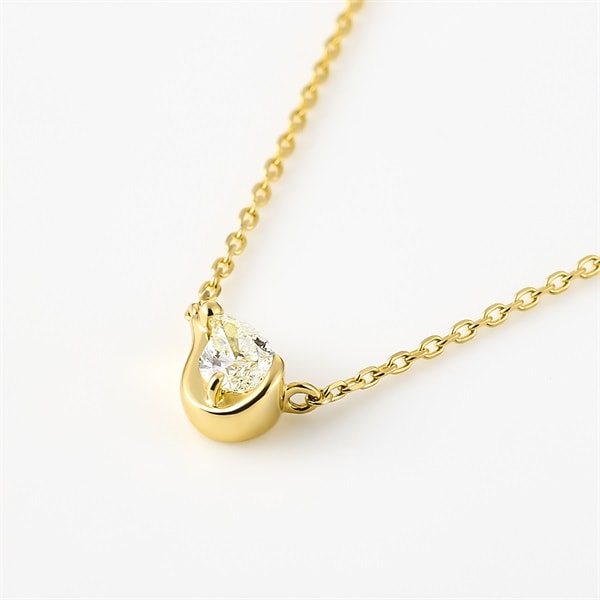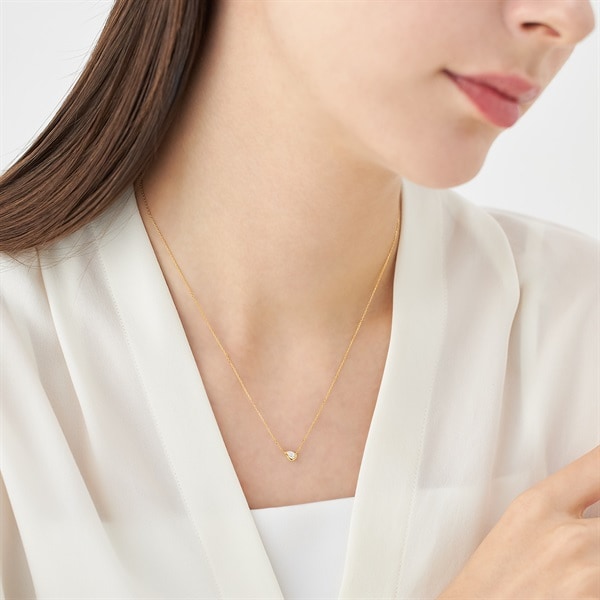 「Drop in the water」〜はじまりのひとしずく〜ひとつひとつの小さなしずくがやがて大きな流れを作り出し力強い流れと変化する、そんなはじまりのひとしずくをイメージしたコレクション。熟練の職人による、4℃オリジナルの「リープカットダイヤモンド」をセッティング。まさにひとしずくが、したたり、跳ねる一瞬をうつし取ったかのような輝きと優美なカットです。K18イエローゴールドのネックレスはデコルテに華やかさを添え、アシンメトリーなデザインがさり気ない個性を演出します。