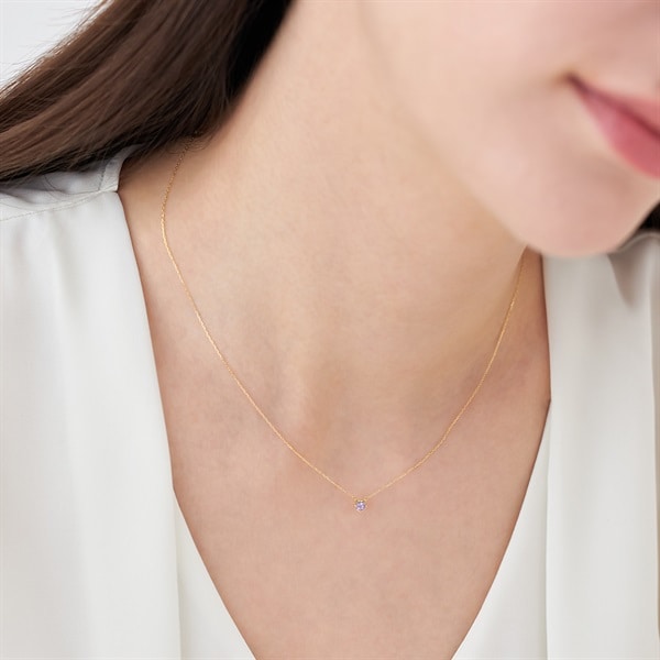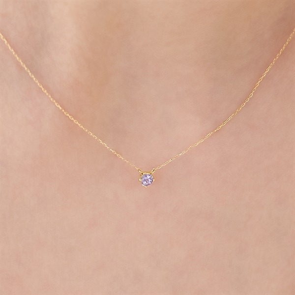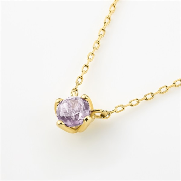 バースストーンを1粒留めた“Bouquet”シリーズ。 4枚の花びらが誕生石を優しく包み込む。そんなイメージでデザインしたK10ネックレス。誕生石を色とりどりの花に見立て、身を寄せ合う姿はまるで花束のよう。そんな姿から“Bouquet”と名付けました。誠実な愛をもたらすといわれる2月の誕生石アメシストが胸元を華やかに彩ります。 ※天然石・天然素材を使用しているため、実際の色味や風合いが異なる場合がございます。