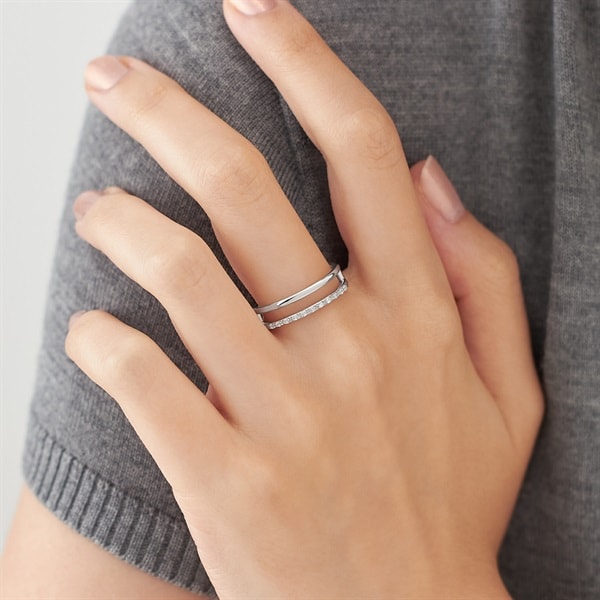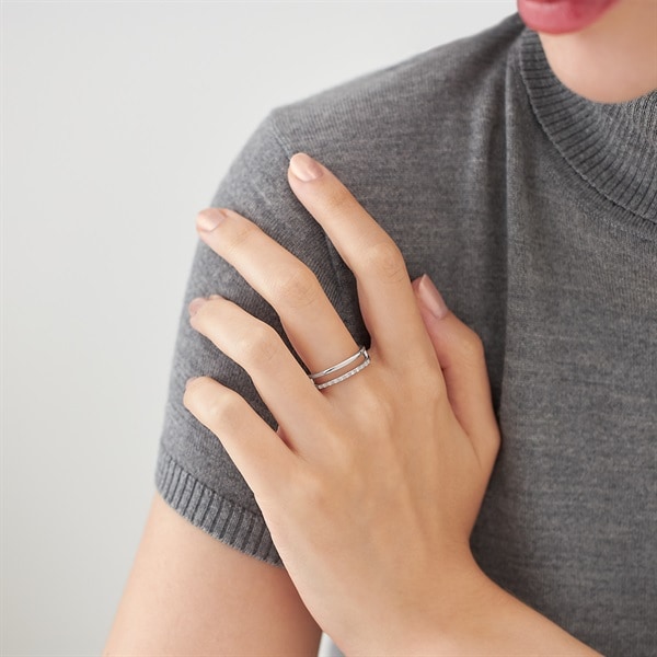2連のモダンな雰囲気のあるリング。2本の地金のラインがスッキリとスタイリッシュな手元を演出します。空間を開けることで指を綺麗に見せる効果があるのもポイント。1本でスタイルの幅がぐっと広がります。※ボリューム(幅)のあるリングは、通常より着用時にサイズが小さく感じる場合がございます。