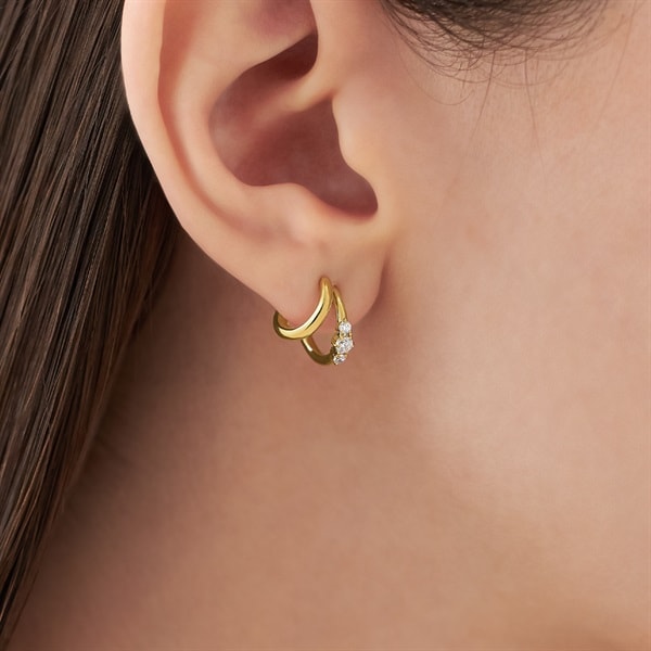 シンプルなラインと華やかなキュービックジルコニアが入った、2本のラインがひとつになったイエローゴールドコーティングのフープピアス。見る角度によって表情が変わるデザインは、やわらかさとしなやかさを表しています。選べる2カラー展開で、日常に洗練された輝きを添えてくれます。