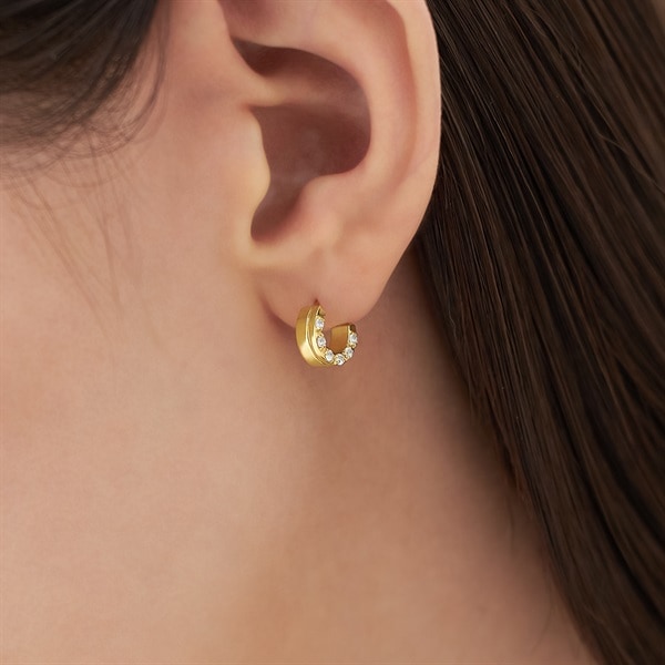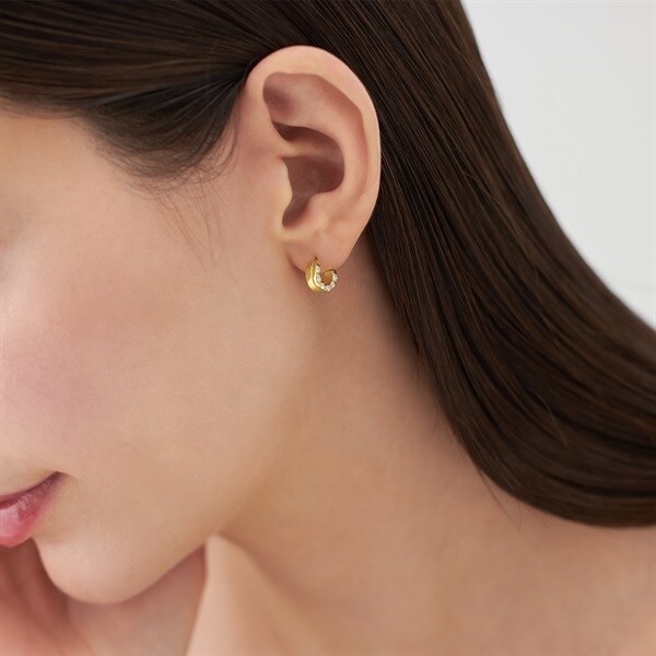 パーツのディテールが魅力のサークルシリーズ。ボリュームのあるフープピアスに仕上げました。片耳サイドにのみ石を留め、内側に向けても楽しめるデザインで、ベーシックながらも遊び心を添えています。モダンで身に着けやすく、日常にさり気ない輝きをプラスするアイテムです。【コーディネートアイテム】品番:112544120901 ネックレスはこちら >