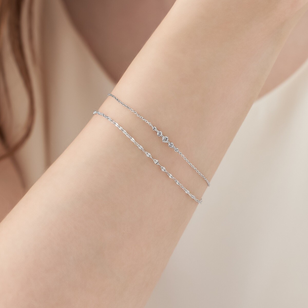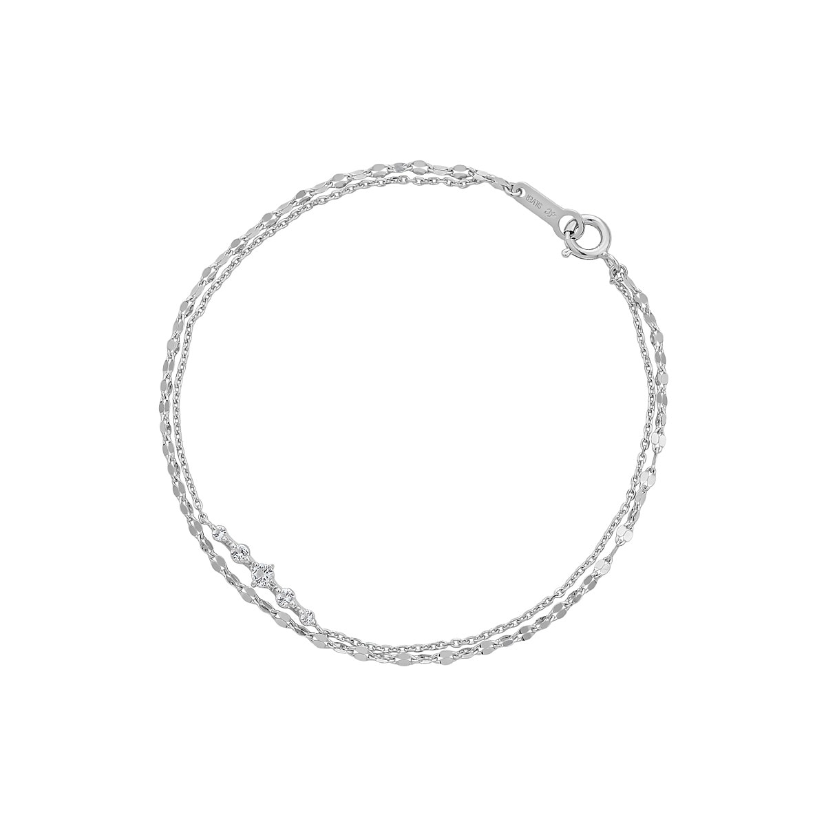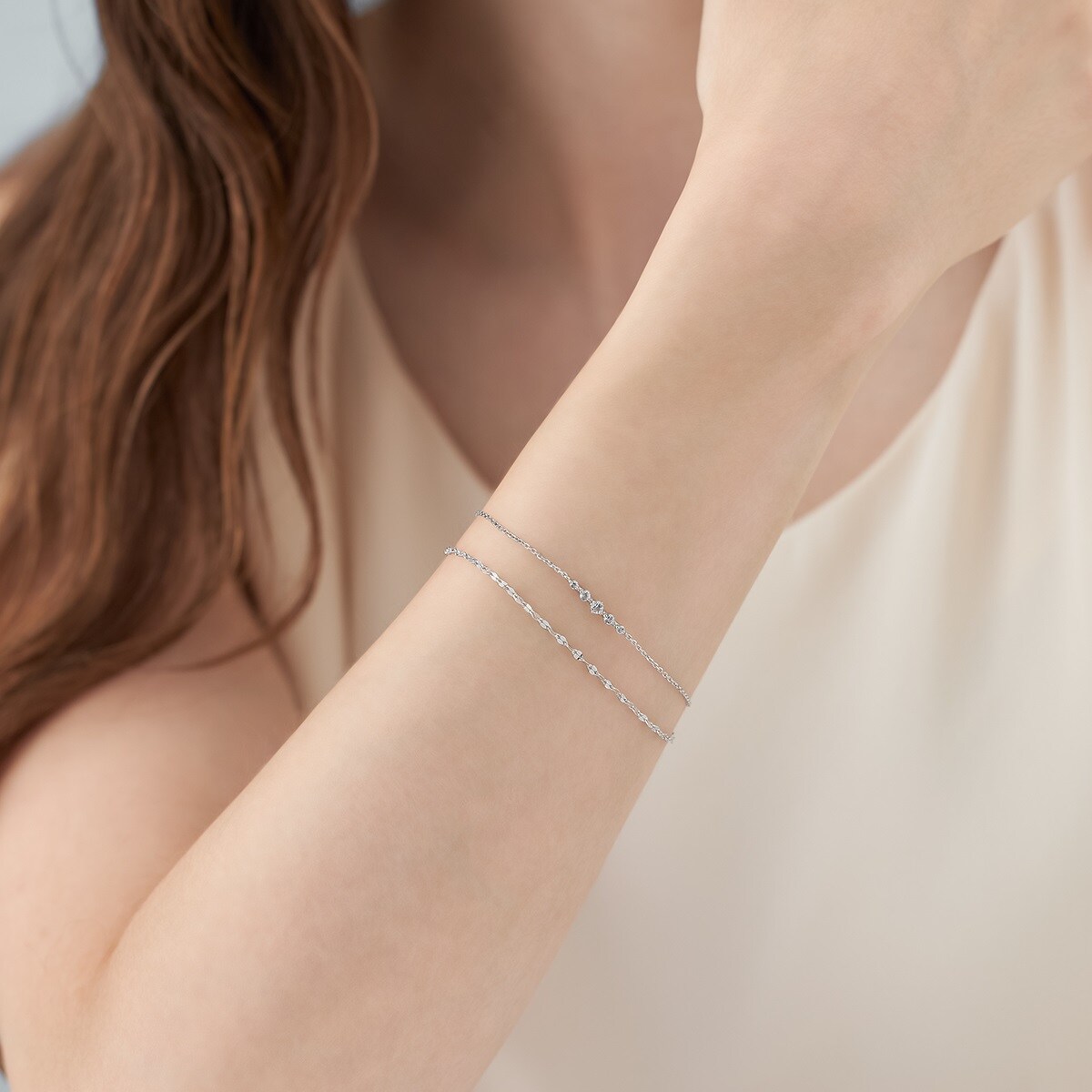 Holiday Collection一覧はこちら >〈Lucentveil〉静寂に包まれた冬の朝、透き通る光と雪の煌めきを纏ったホリデーコレクション。煌めく雪の粒をイメージした、透明感溢れるホワイトトパーズを連ねた2連のプラチナコーティングのブレスレット。メインストーンを6点留めにすることで、さりげなく雪の結晶を思わせる上品なデザインに仕上げました。お持ちのジュエリーにもスッとなじみ、特別な日の装いにもぴったり。シーンを選ばず身に着けられる品のよさが魅力のアイテムです。 [シルバーグレーの霜のような光沢のあるベロアの数量限定ケース付き] なくなり次第終了※ショッピングバッグ内の画像が限定ケースではない場合、限定ケースのお取り扱いは終了しております。