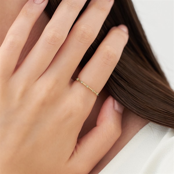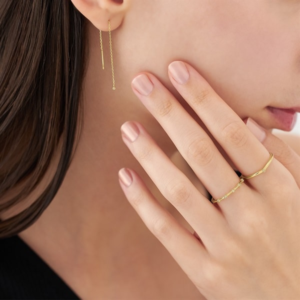 繊細なカットが入ったラインに小さく煌めくダイヤモンドをほどこしたリング。シンプルなデザインの中に細やかな輝きが光るのも魅力です。スッキリとしたフォルムで幅広いシーンで着用できます。ギフトにも自分へのご褒美にもおすすめです。※天然石・天然素材を使用しているため、実際の色味や風合いが異なる場合がございます。※ボリューム(幅)のあるリングは、通常より着用時にサイズが小さく感じる場合がございます。【コーディネートアイテム】品番:112546153010 ピアスはこちら >品番:112546143008 リングはこちら >