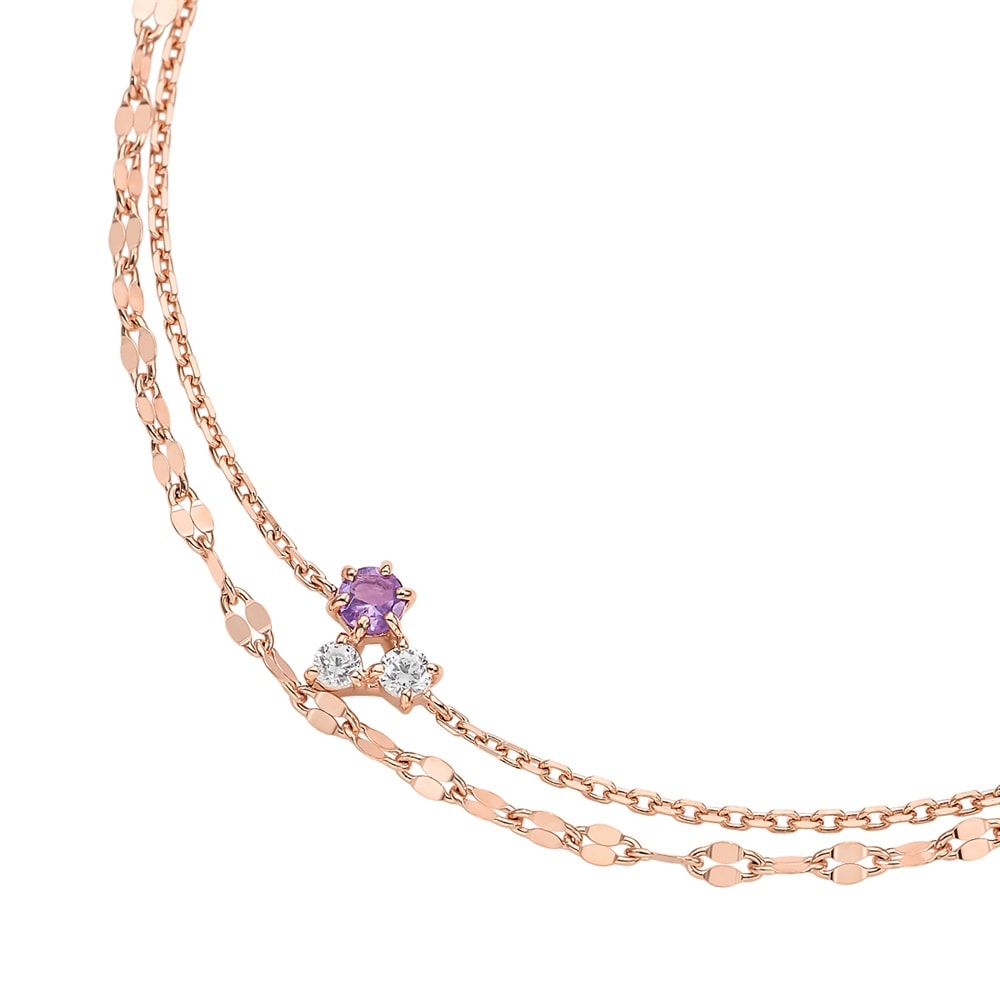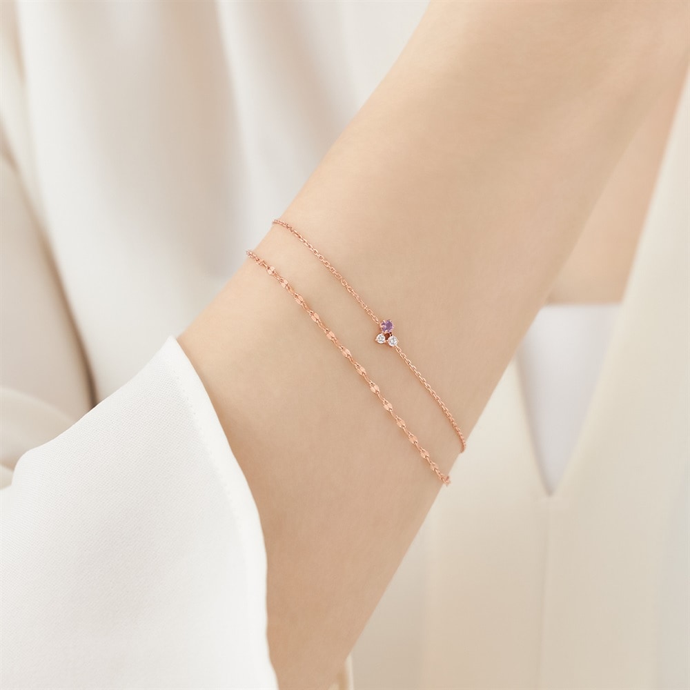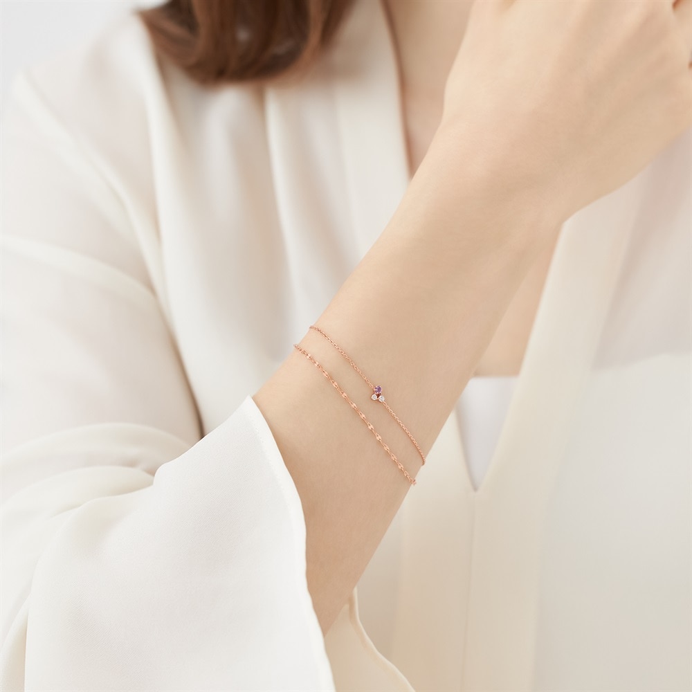 2月の誕生石、アメシストをセッティングした数量限定の誕生石コレクション。 アメシストとキュービックジルコニアを留めた石寄せの2連ブレスレット。 キラキラと輝くデザインチェーンが腕元を華やかにしてくれます。 2月の誕生石であるアメシストは誠実な愛をもたらすといわれ、淡い紫色が腕元を華やかに彩ります。シンプルなデザインでどのようなテイストのファッションにも合わせやすく、大切な方へのプレゼントとしてもおすすめです。 ※天然石・天然素材を使用しているため、実際の色味や風合いが異なる場合がございます。 [数量限定ケース付き] なくなり次第終了※ショッピングバッグ内の画像が限定ケースではない場合、限定ケースのお取り扱いは終了しております。