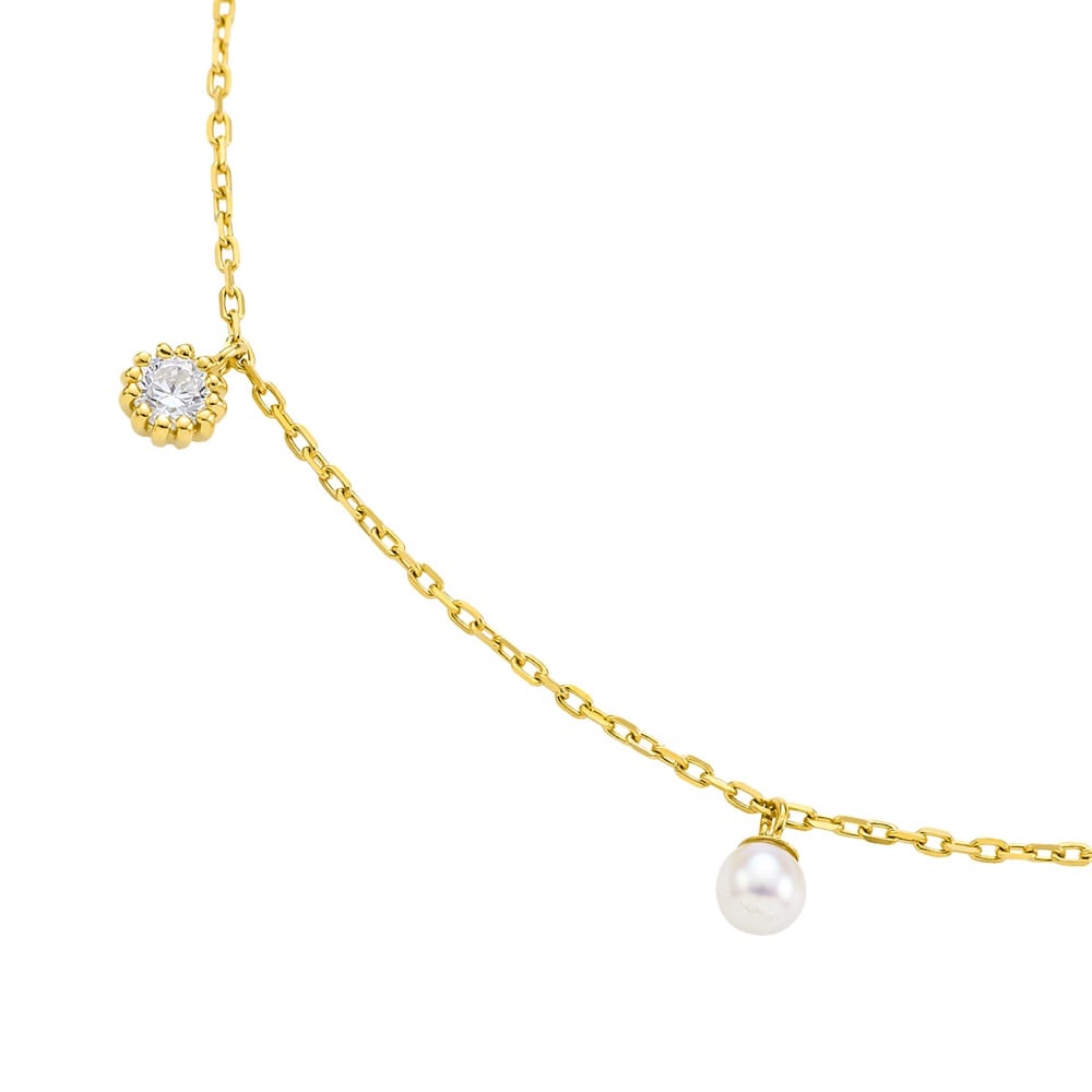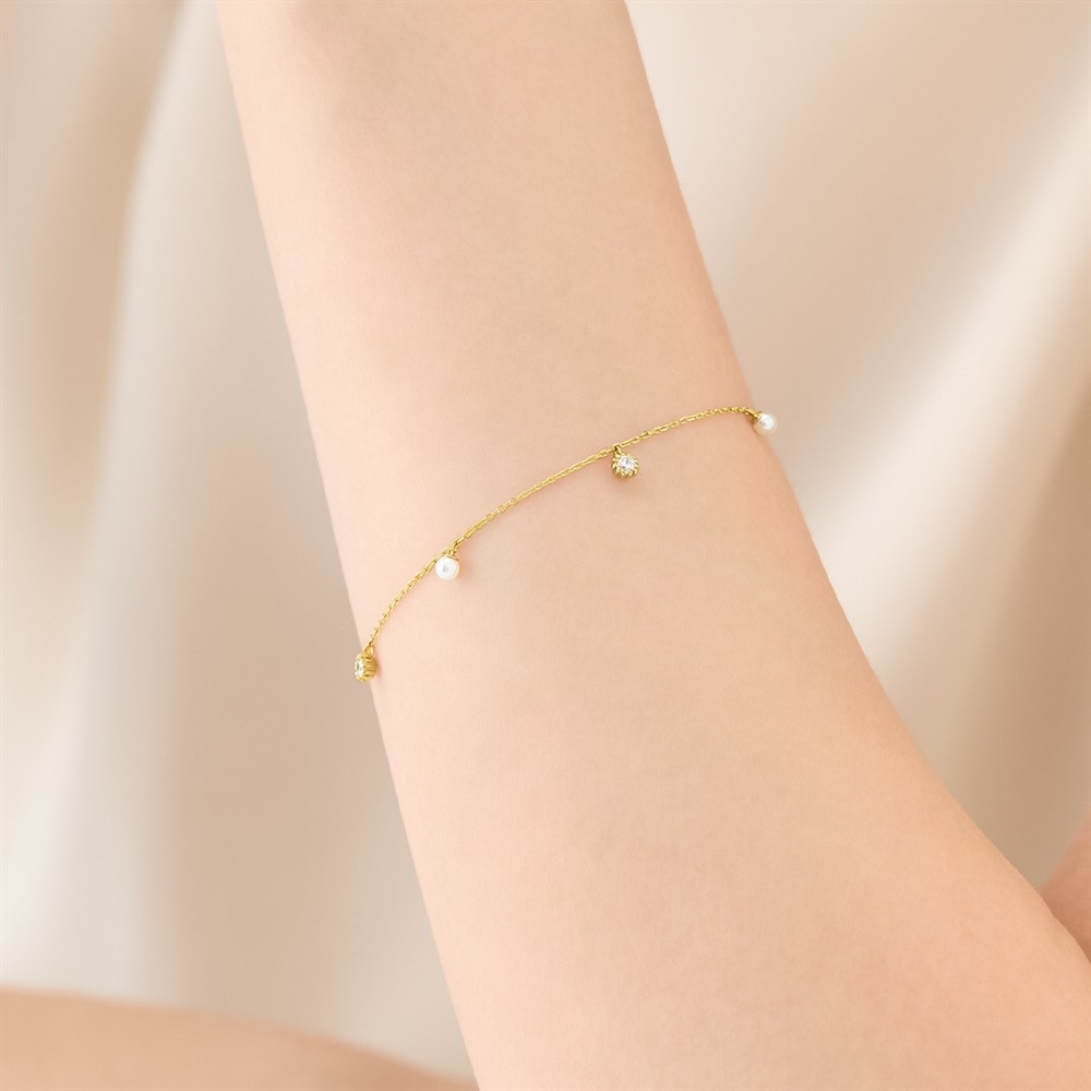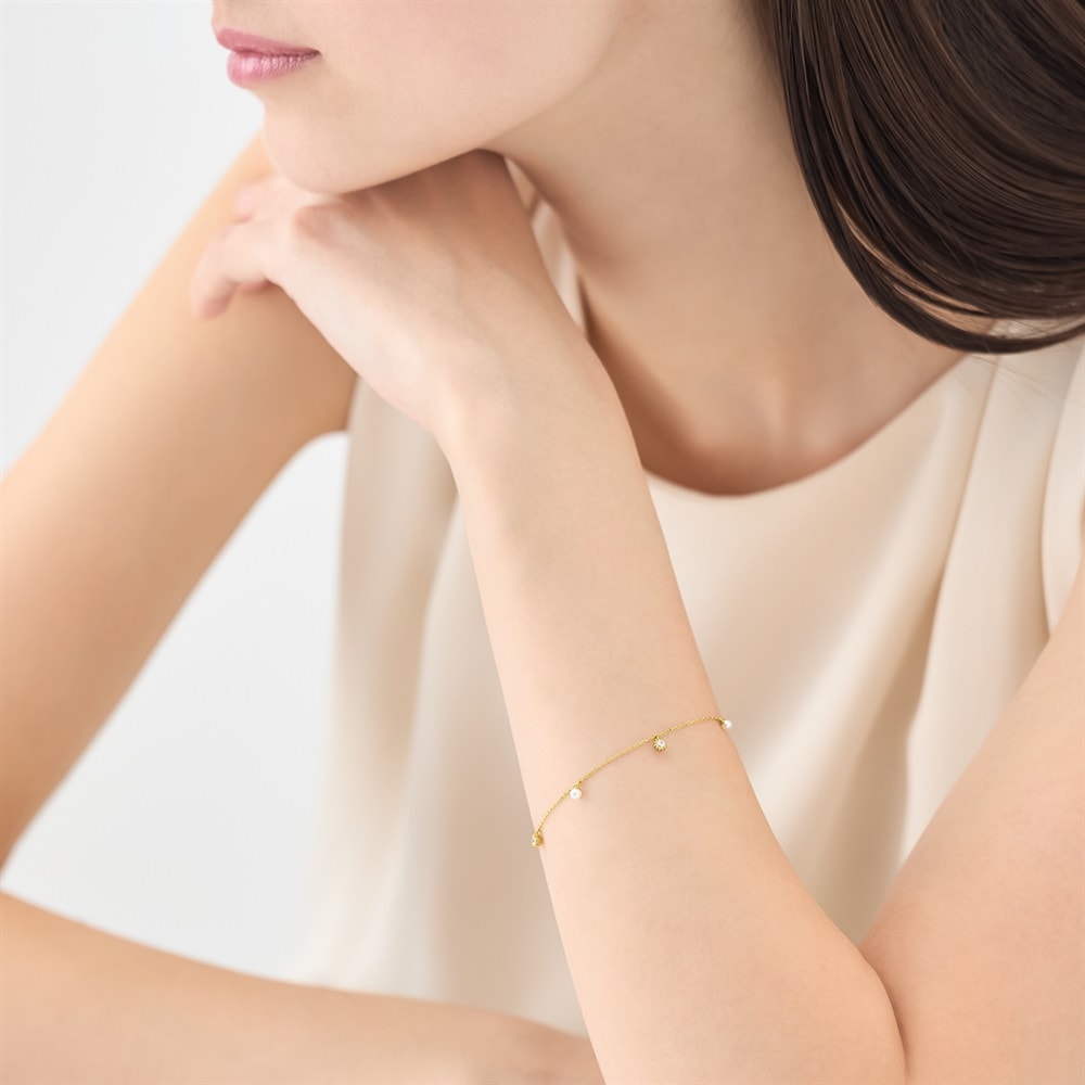 小さく可憐な花々を表現したPetite Bloomsコレクション。 プチパールとキュービックジルコニアが可憐に揺れるシロツメクサモチーフのブレスレット。 動くたびに軽やかに揺れるブレスレットが華やかさをプラス。フリーアジャスターで腕に沿うようにタイトな着用もできるので、腕元のレイヤードも楽しめるアイテムです。 ※天然石・天然素材を使用しているため、実際の色味や風合いが異なる場合がございます。